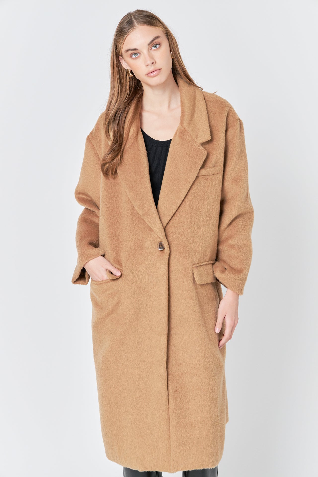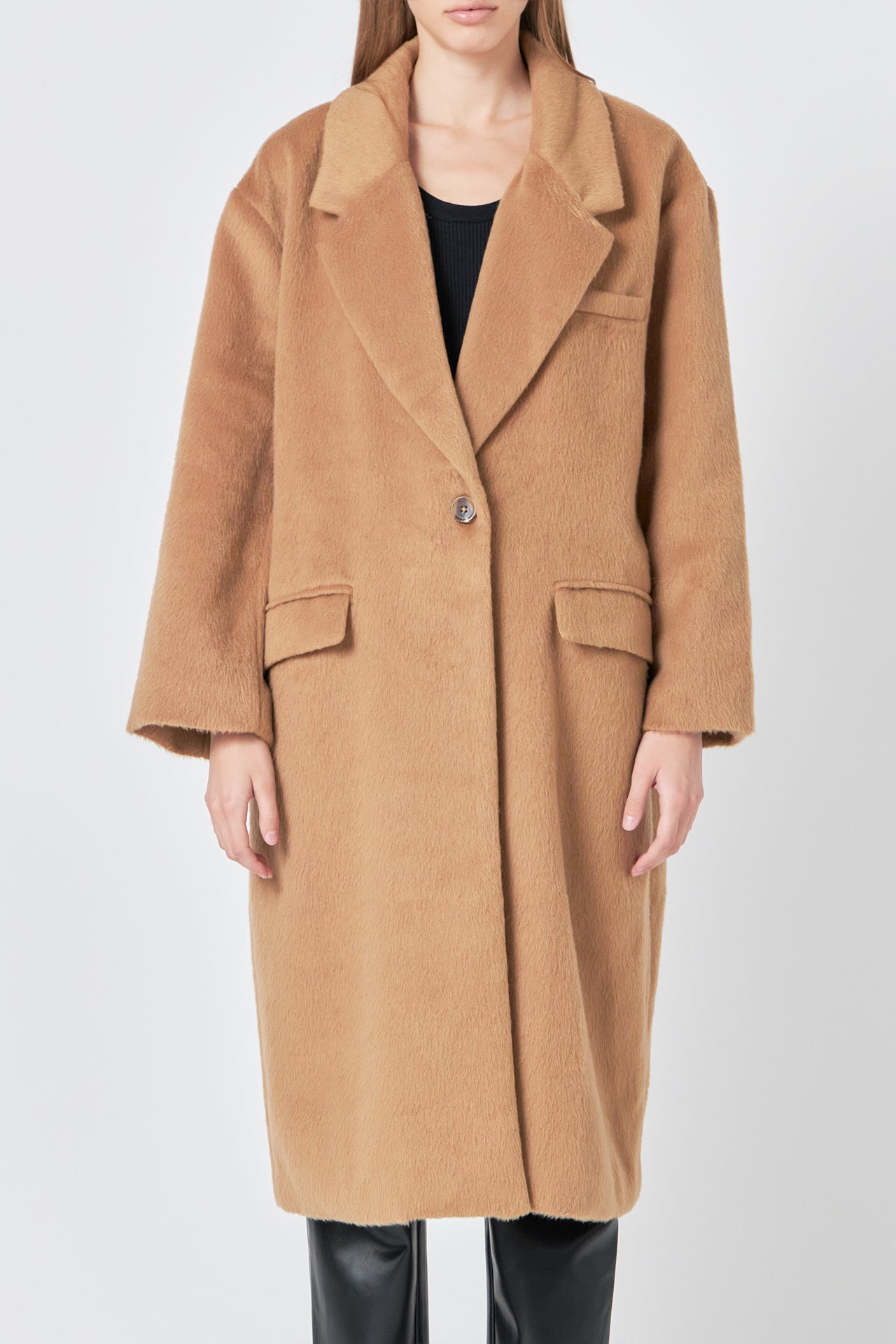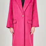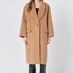 Stay on trend with our Single Button Oversize Coat. Its oversized fit exudes effortless style, while the drop shoulder and long sleeves offer ultimate comfort and a relaxed look. The large notch lapel adds a touch of sophistication to this must-have coat. Perfect for any occasion, this coat is a versatile addition to your wardrobe. Made with quality materials and designed with the latest fashion in mind, our Single Button Oversize Coat is a must-have for any fashionista. Shop now and elevate your outerwear game with our statement piece.