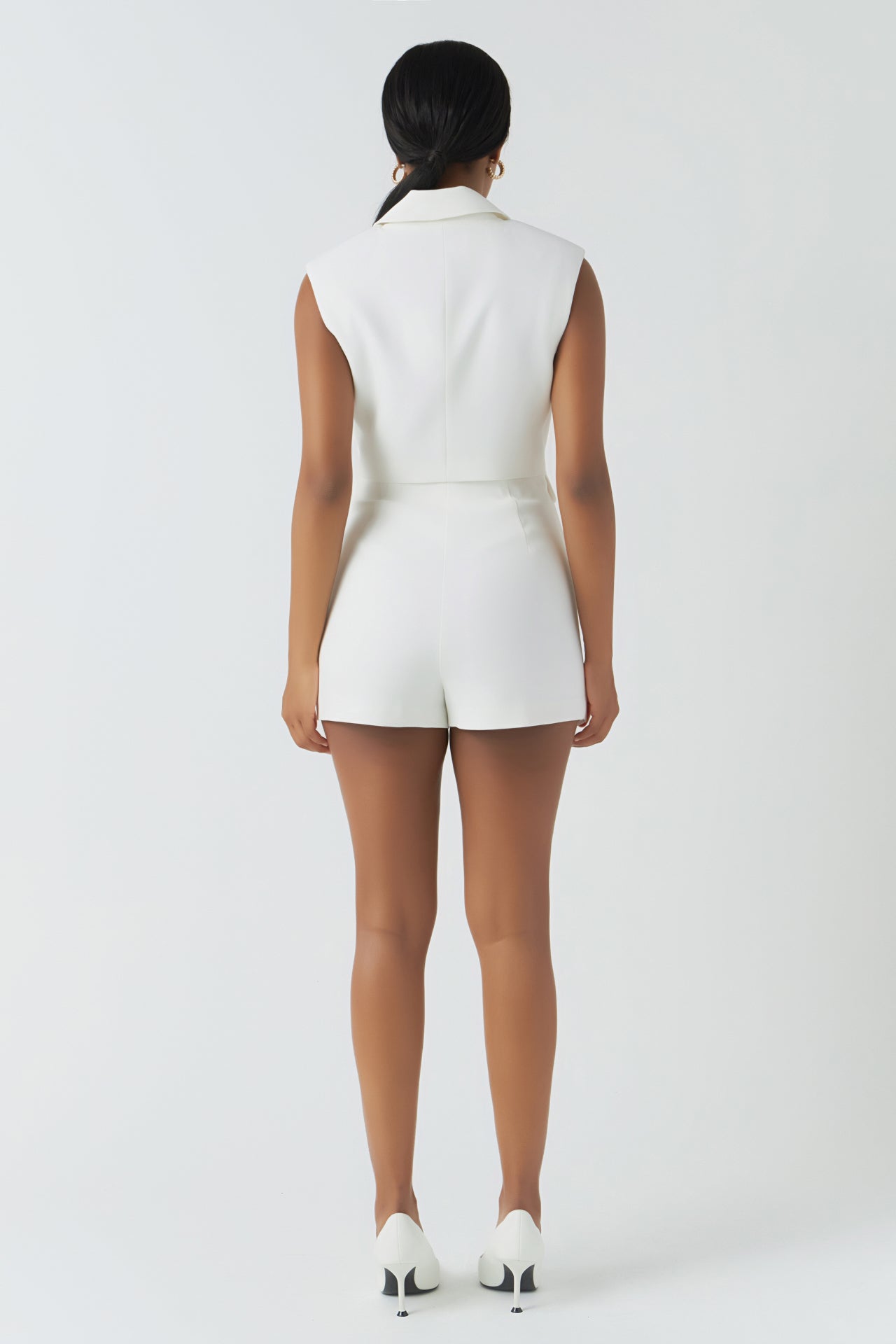 Make a statement with this stylish Sleeveless Blazer Romper. With the shape of a blazer but the convenience of a romper, you'll achieve sharp sophistication with this look. Padded shoulders and welt flaps accentuate your silhouette, while gold buttons add a touch of glamor. An open back completes the look, making it perfect for any occasion. Say hello to power dressing with a modern edge - no blazer required!