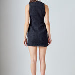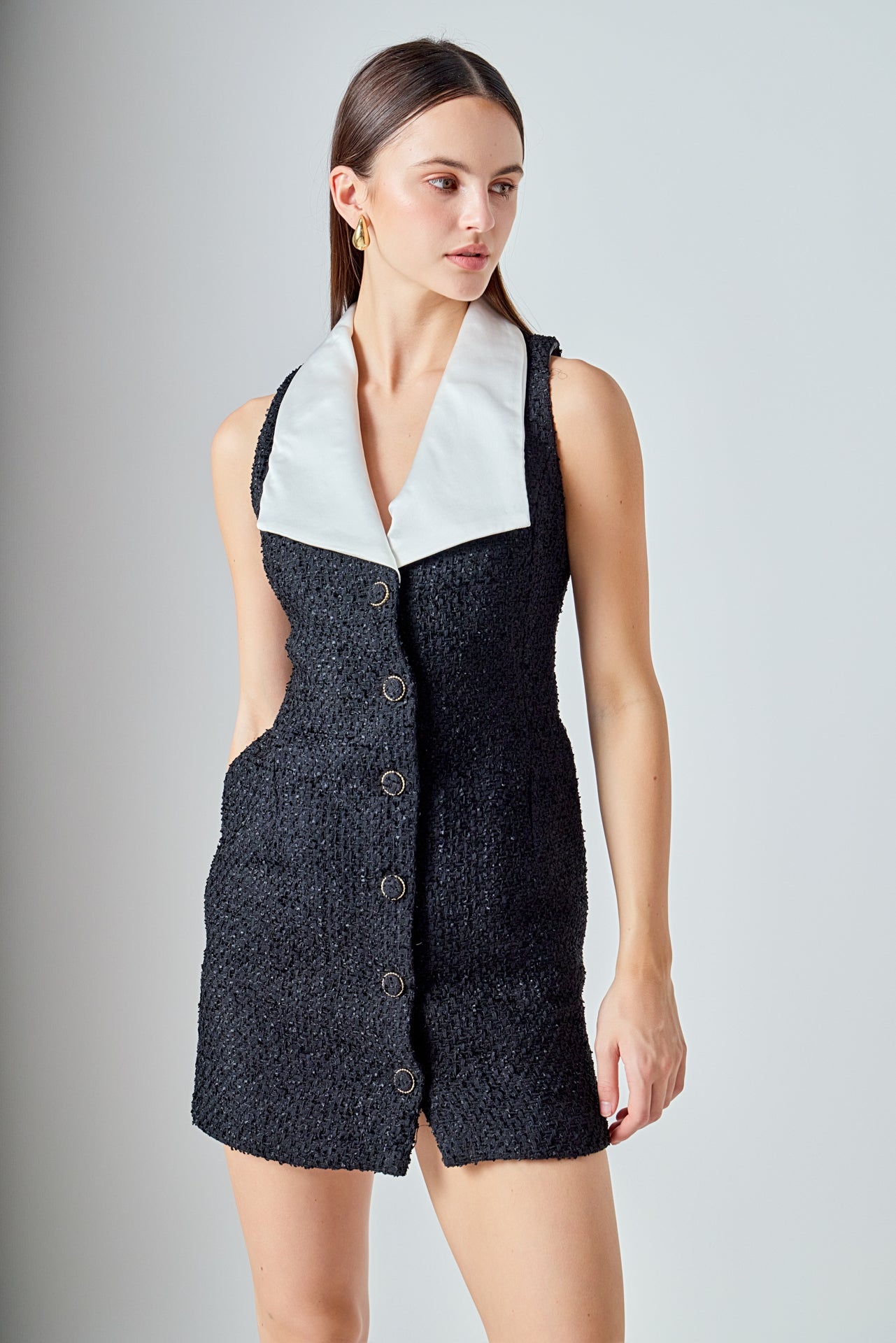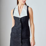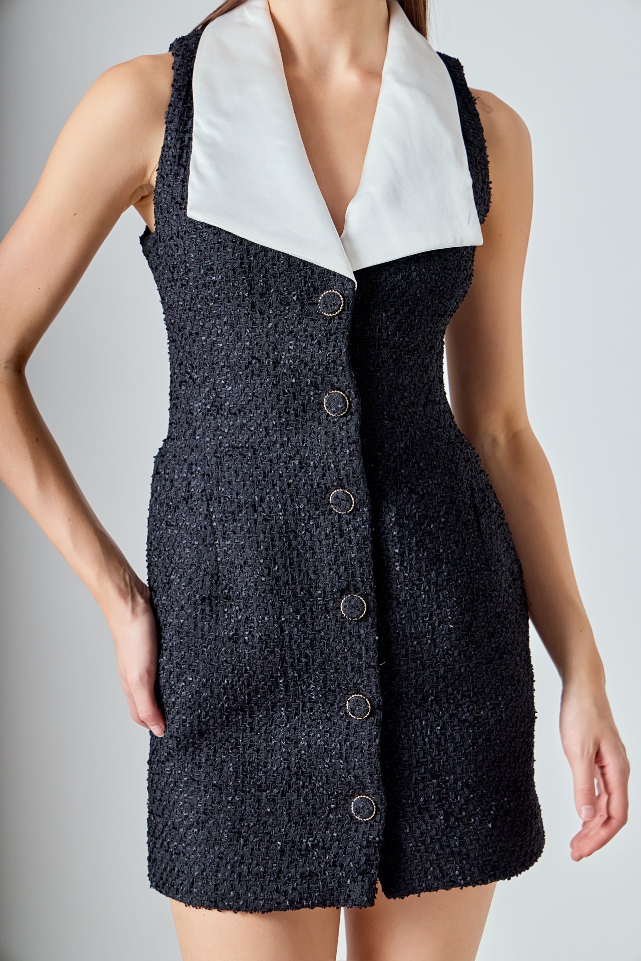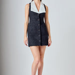 This little black dress balances femininity and masculinity with elements like the statement collar and fitted silhouette. The tweed mini dress is finished with gold-rimmed tweed buttons and lined side pockets.