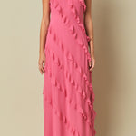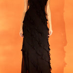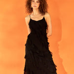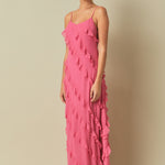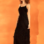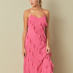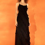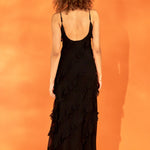 This Slip Ruffled Dress features a classic V-neckline and ruffled details for a timeless feminine look. The open back allows for comfortable wearability. Perfect for special occasions this dress will give you an elegant and stylish look.