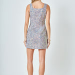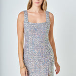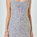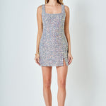 This Slit Detail Tweed Mini Dress is a must-have for any sophisticated wardrobe. Made with tweed fabric and a touch of sequins for an eye-catching finish it features a flattering square neckline sleeveless silhouette and slim-fit design with a concealed side zipper for an easy fit. Stand out from the crowd in this unique tweed dress that is sure to make a statement.