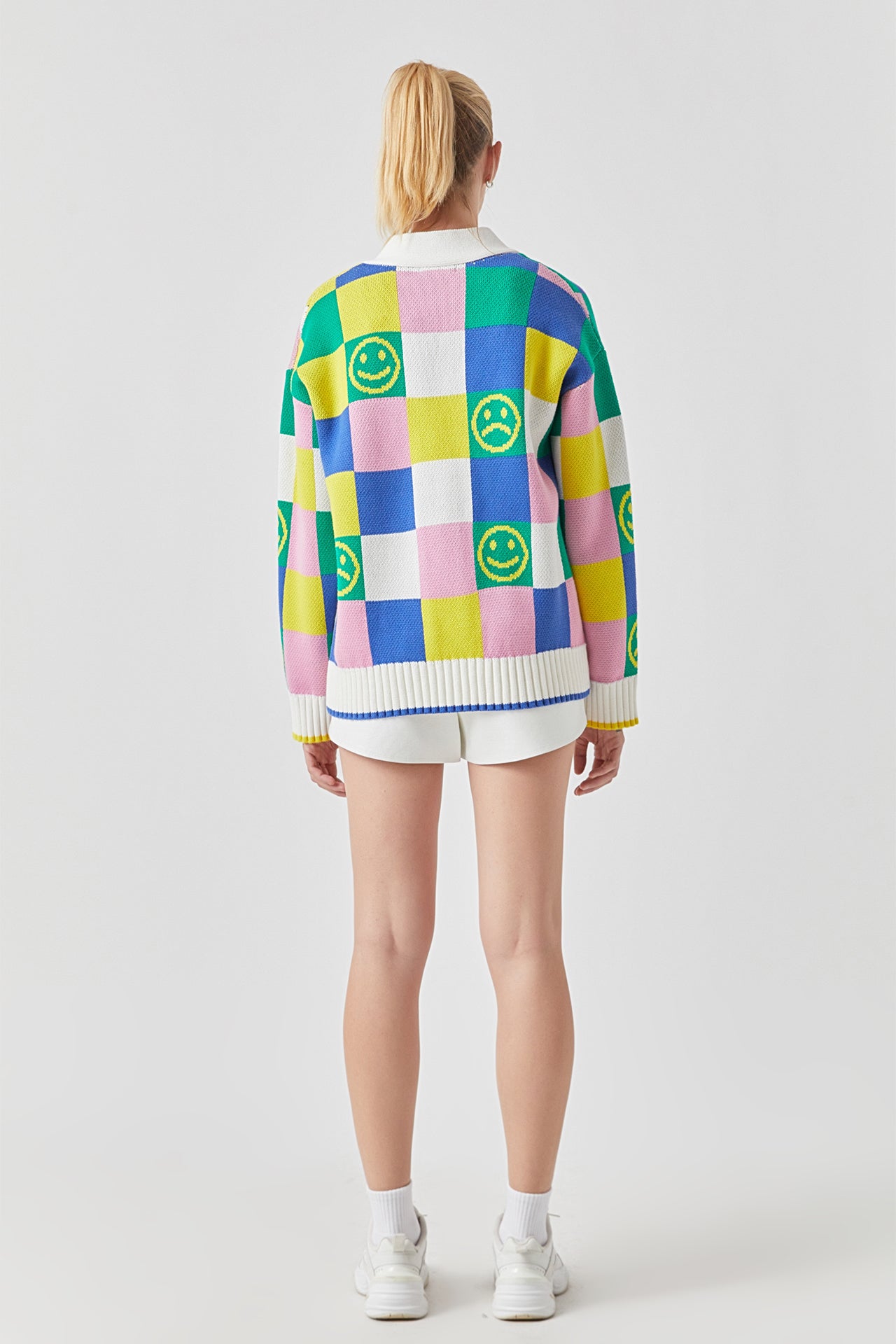 Color block with a smile! This playful cardigan is sure to add some fun to your winter wardrobe. The bright colors and smiling face will make you feel cheerful on even the dreariest of days. Snuggle up in this cardigan on a cold winter night or wear it over a dress for a fun evening out.