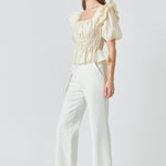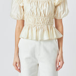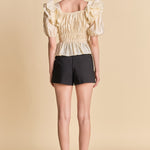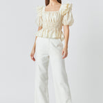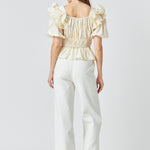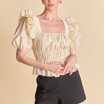 Our beautiful Smocked Puff Sleeve Top is the perfect piece to put on when you want to give your outfit a feminine flair. The puffy short sleeves are accentuated with dramatic ruffle detailing and a flattering square neckline. The smocked bodice forms to your body and flairs into a peplum silhouette