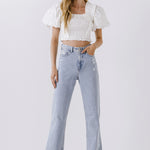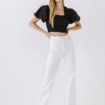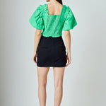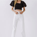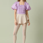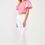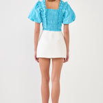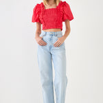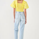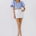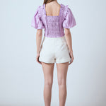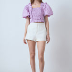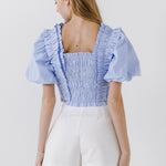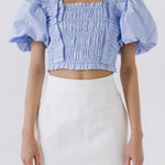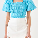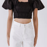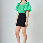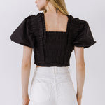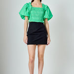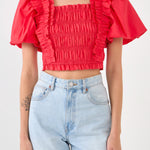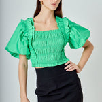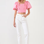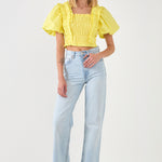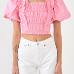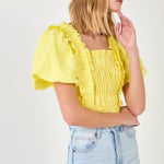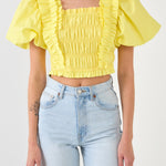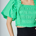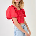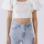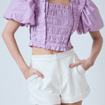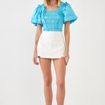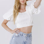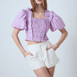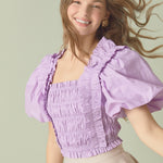 This top is perfect for those days when you want to feel cute and comfortable. The smocked bodice ensures a flattering fit while the folded ruffle detail adds a touch of personality. Plus the short puff sleeve provides just the right amount of coverage.
