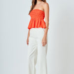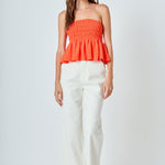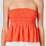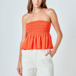 Elevate your summer style with our Smocked Strapless Top. This must-have top features a flattering strapless design and a trendy peplum skirt that adds a touch of femininity to any outfit. The smocked bust ensures a comfortable and secure fit while the non-sheer fabric provides the right amount of coverage. Perfect for any occasion, this versatile top can easily be dressed up or down. Elevate your wardrobe with this must-have piece and make a statement wherever you go. Shop now and stand out with our Smocked Strapless Top.
