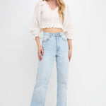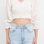 This top is sure to get you noticed. With its smocked detail and playful ruffle trim, this crop length top is perfect for a night out. Made with 3/4 sleeves, it's airy and comfortable for any occasion. Style this top with a skirt or jeans for a versatile look that you can wear anywhere.