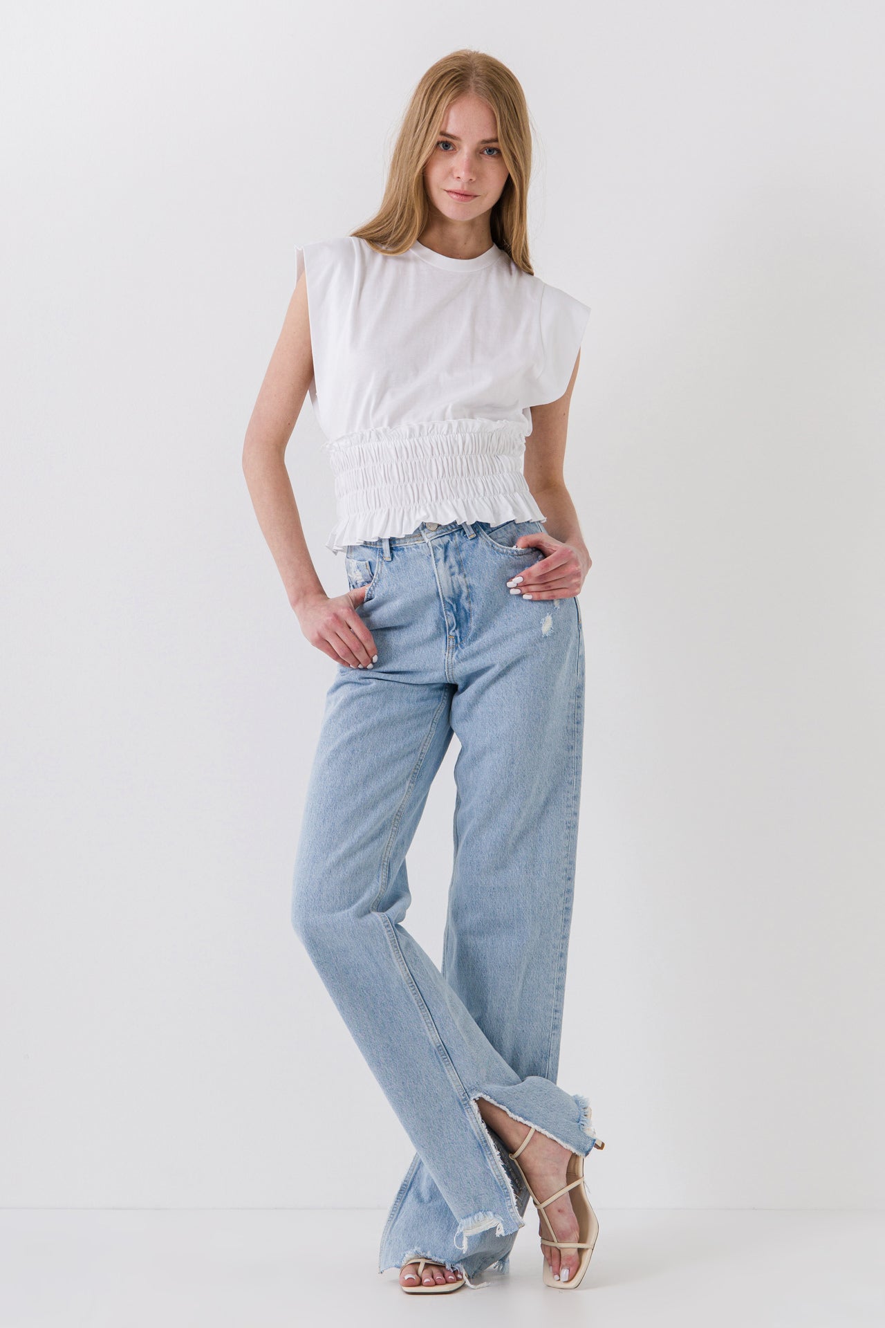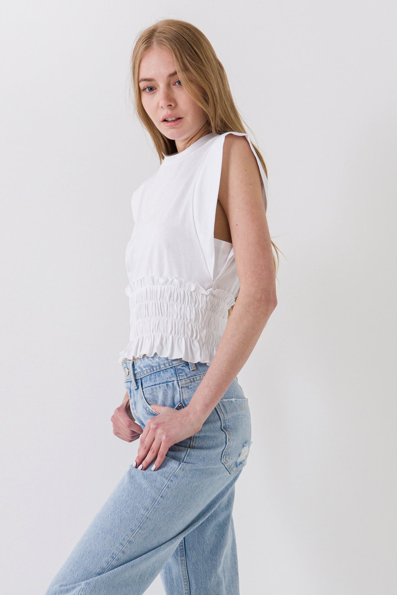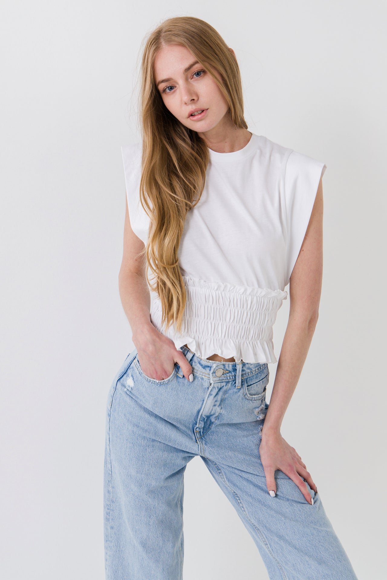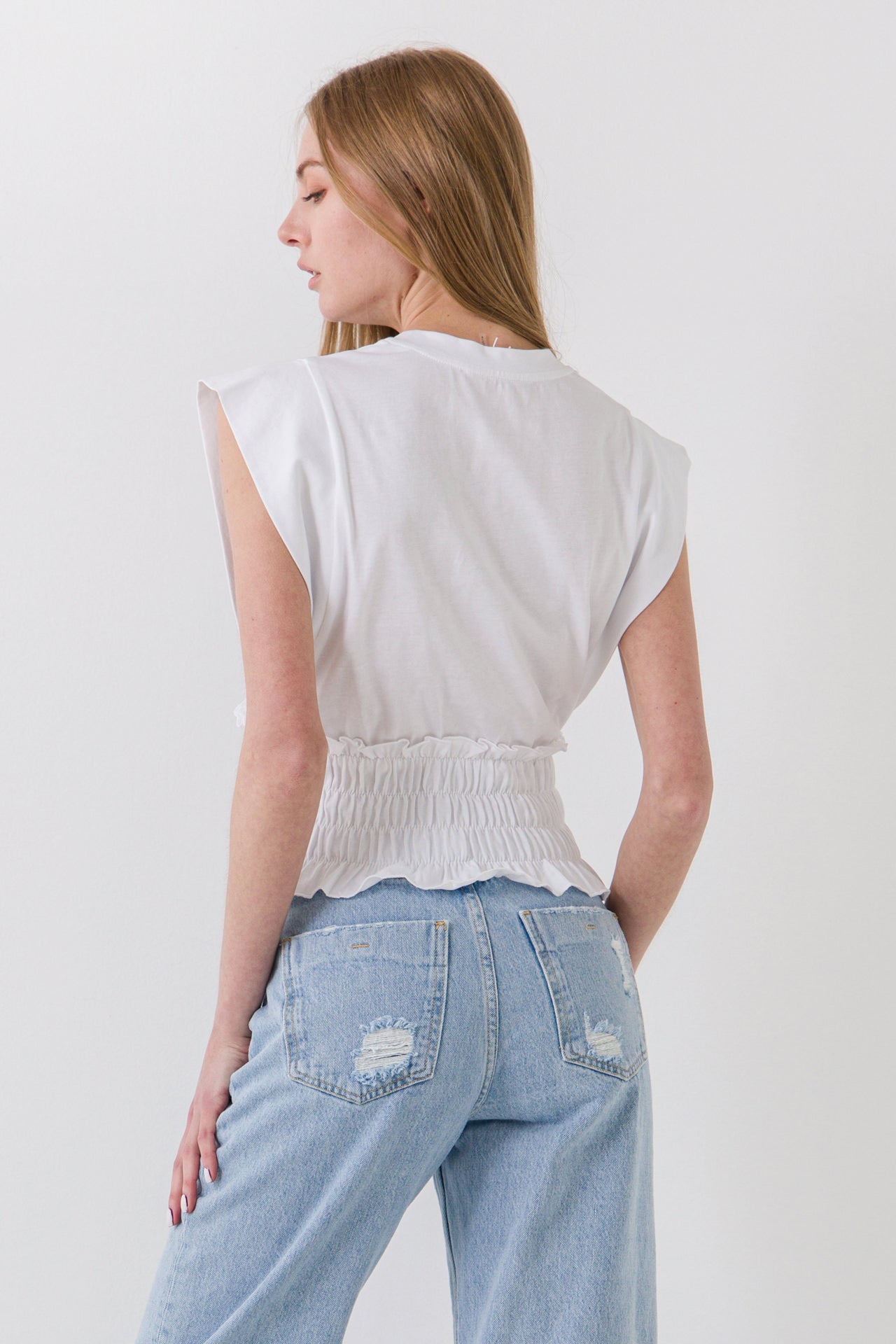 Introducing our Smocked Waist T-Shirt, the perfect addition to your wardrobe! Made with a comfortable knit fabric, this top is perfect for everyday wear. The cap sleeve design adds a touch of femininity to the classic t-shirt style. The smocked waist cinches in at just the right spot, highlighting your curves in all the right ways. As if that wasn't enough, this top also features adorable ruffle details for a playful touch. Upgrade your t-shirt game today and stand out in this must-have piece. Shop now and elevate your style with our Smocked Waist T-Shirt!