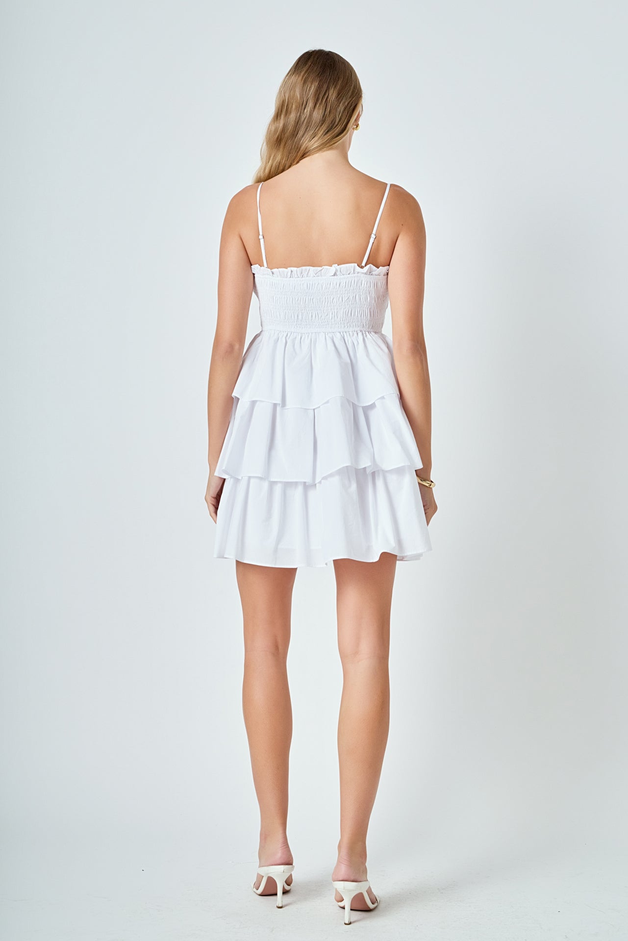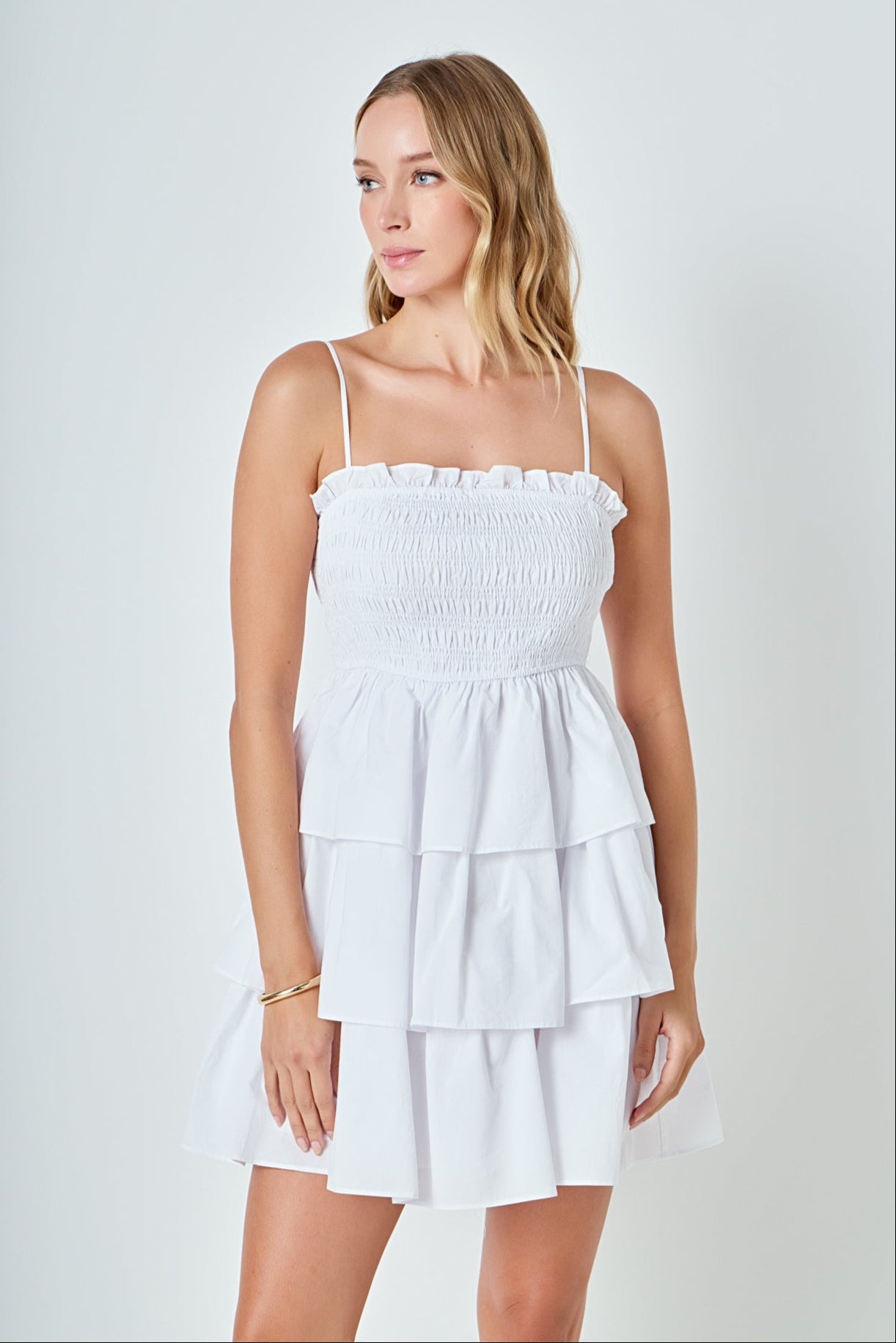The perfect summer dress. Take a break from the sea of little black dresses and slip into something a little more fun. This spaghetti strap dress features beautiful smocking at the bust and tiered layers throughout the body. At mini length, this dress is perfect for showing off your favorite sandals or wedges. And with its lining, you'll stay comfortable all day long.