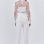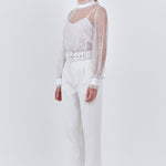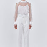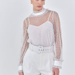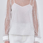 Be the eye of the party in this fancy speckled long sleeve mesh blouse. An elegant neck ruffled detail is what gives this blouse its luxurious allure. Plus a removable cami lining can be added for additional coverage. With a statement piece like this you'll never have to worry about lacking style or missing out on the latest trends.