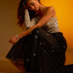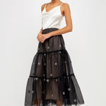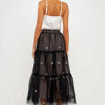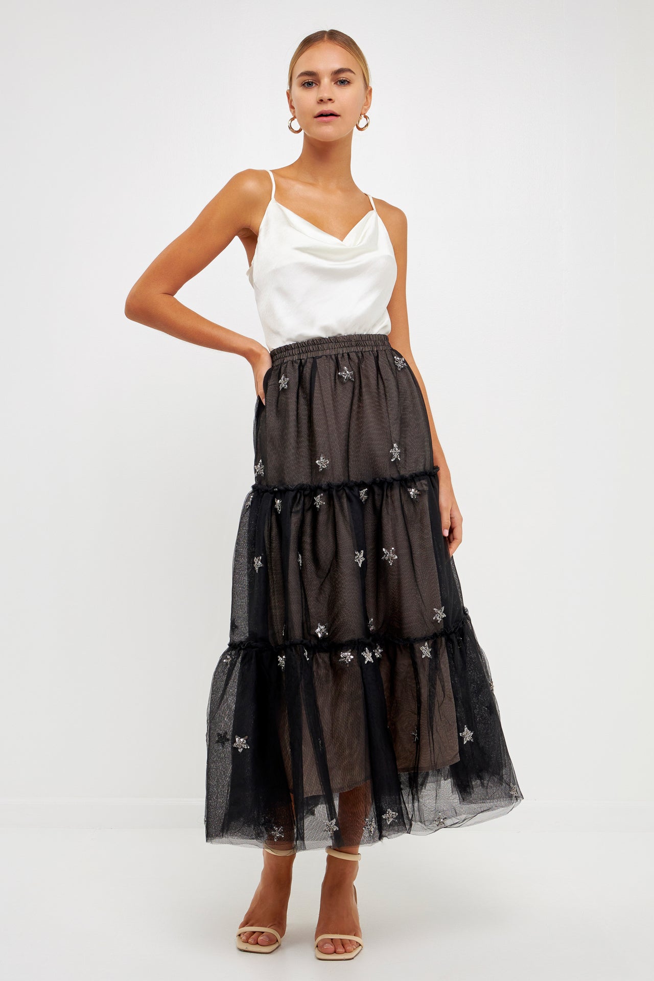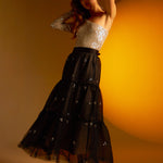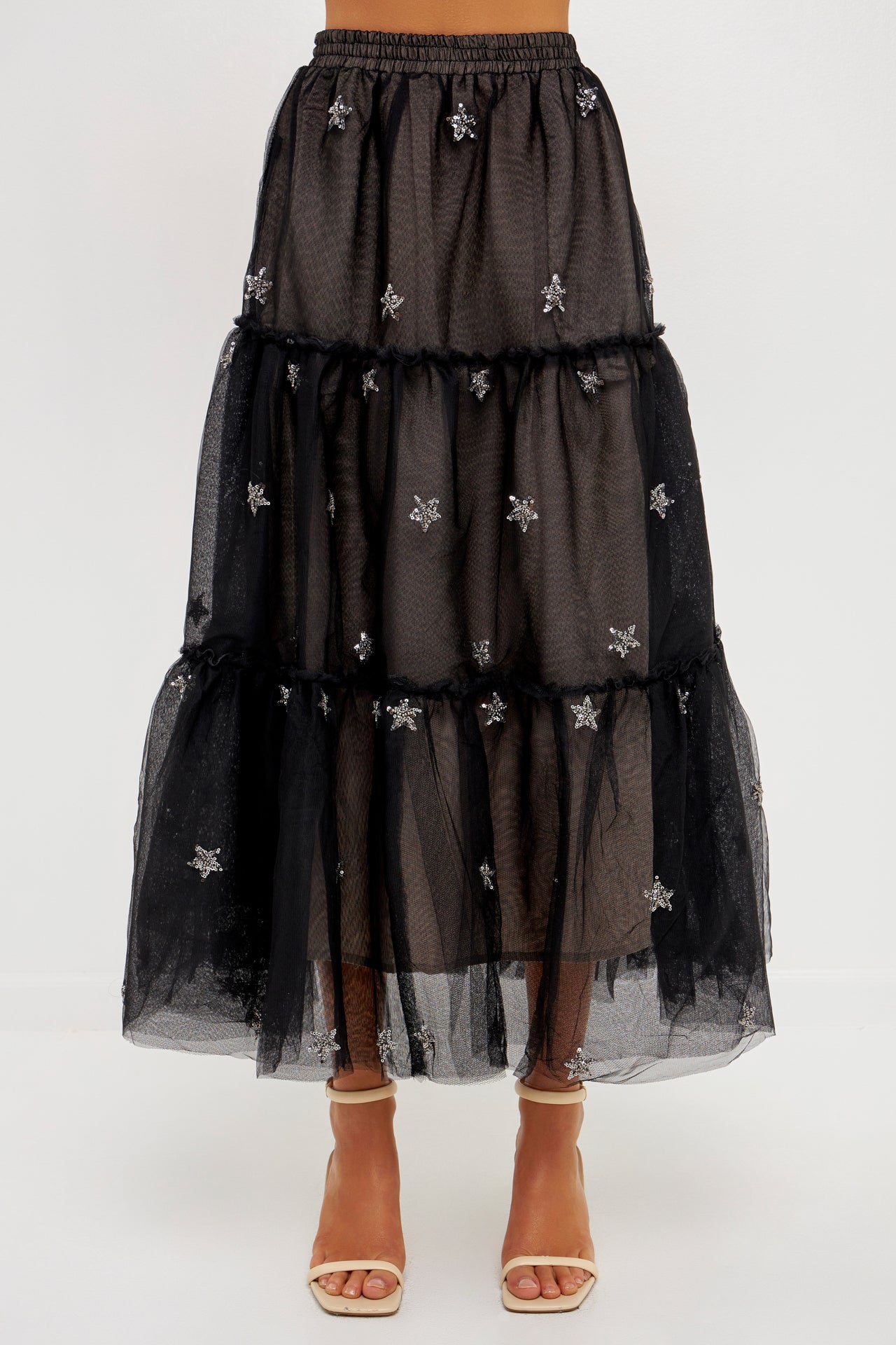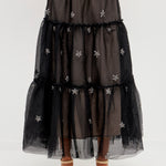 This whimsical and elegant maxi skirt features beautiful stars made of sequins and beads. Sitting high on your waist, the tiered design and layers of tulle create a flattering voluminous shape. Plus, this maxi skirt has pockets (your favorite!).