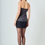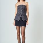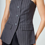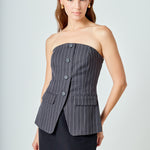 Introducing our must-have Strapless Pinstriped Vest, the perfect addition to your wardrobe. This trendy top features a flattering strapless design, perfect for showing off your shoulders. With a front button closure and welt pockets, this vest is both stylish and functional. Plus, it's fully lined for added comfort. Perfect for dressing up or down, this versatile piece is a must-have for any fashion-forward individual. Made from high-quality materials, this vest will keep you looking chic and feeling comfortable all day long. Upgrade your style game with our Strapless Pinstriped Vest.