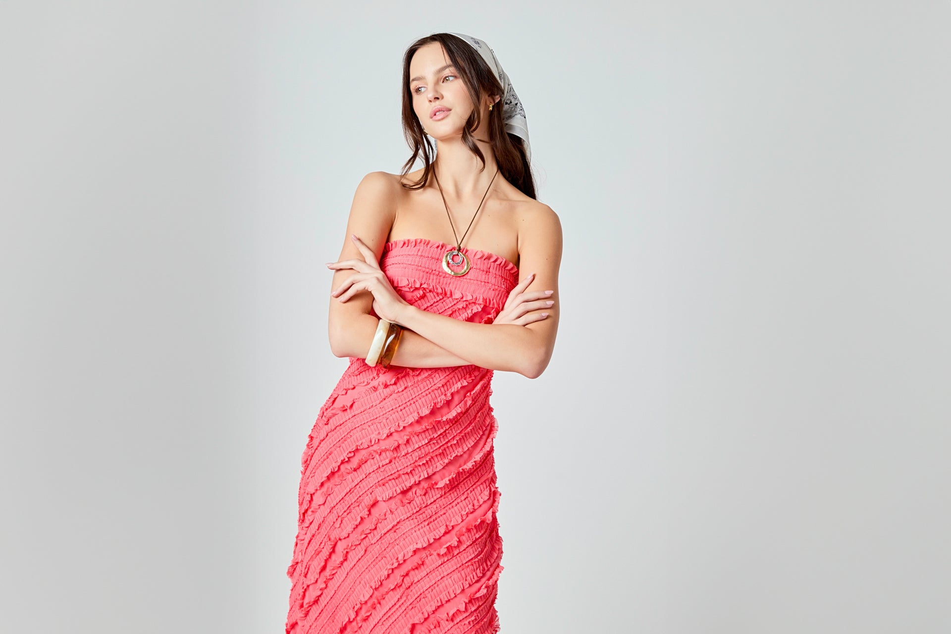 Introducing the Juliette Strapless Ruffled Maxi Dress, an effortless expression of grace and femininity. It is crafted from pleated chiffon and features delicate ruffles and a flowing maxi length. The bias cut flatters the figure with a soft, draped silhouette, while the strapless design adds a striking, modern edge. Ideal for weddings, summer soirees, or any special occasion, this dress promises to make a lasting impression.