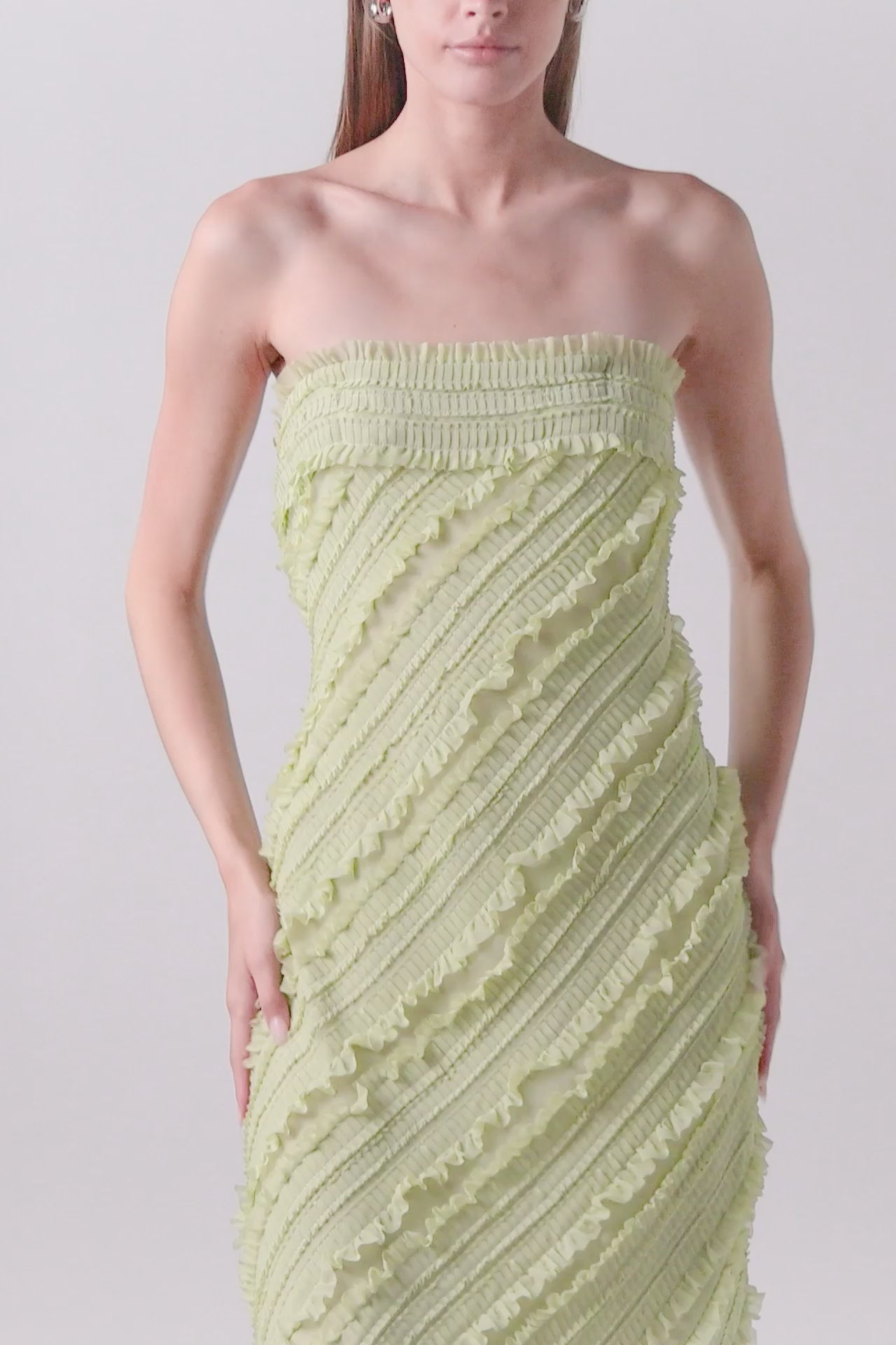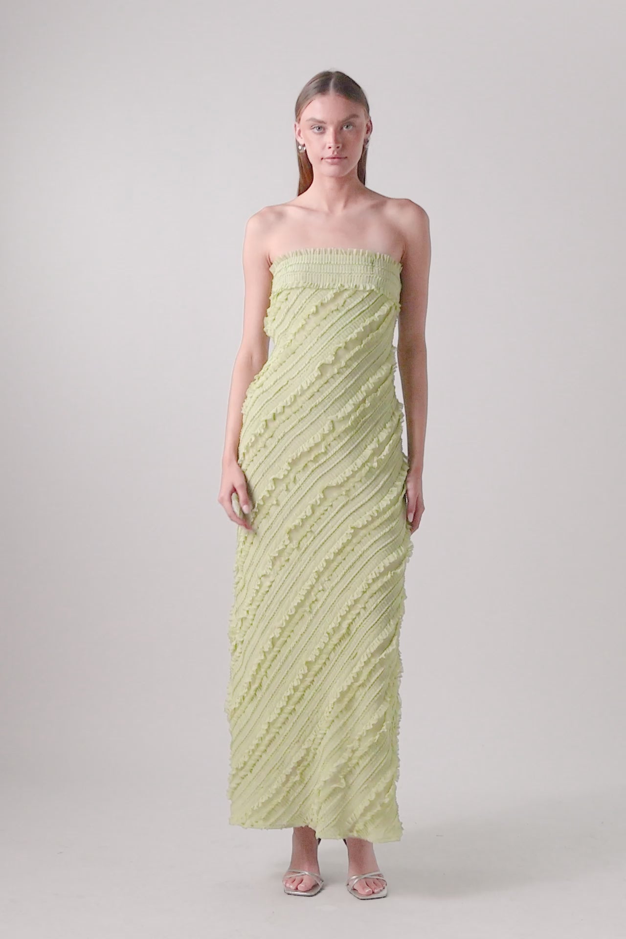 Introducing the Strapless Ruffled Maxi Dress, an effortless expression of grace and femininity. It is crafted from pleated chiffon and features delicate ruffles and a flowing maxi length. The bias cut flatters the figure with a soft, draped silhouette, while the strapless design adds a striking, modern edge. Ideal for weddings, summer soirees, or any special occasion, this dress promises to make a lasting impression.