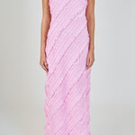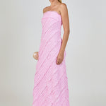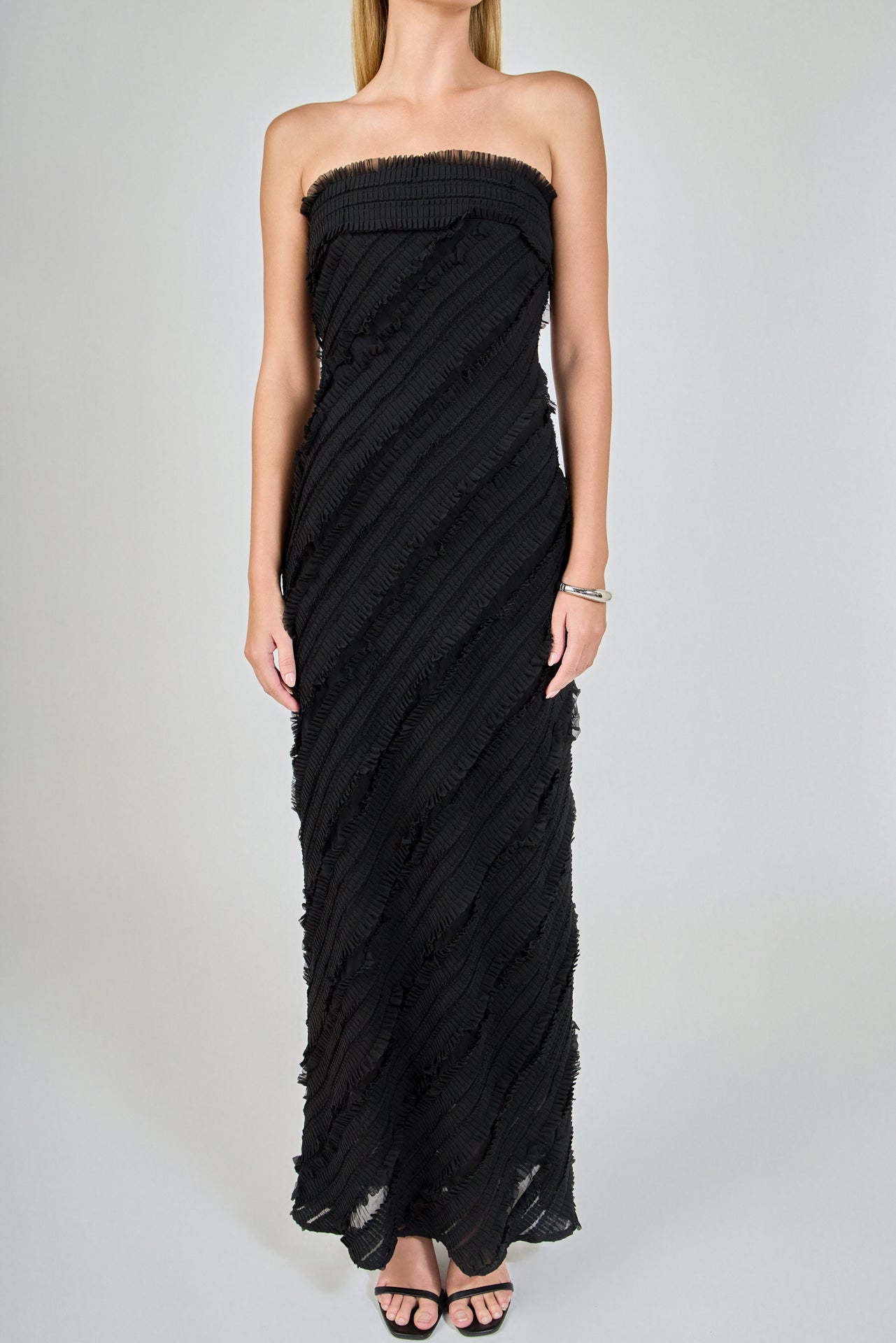 Introducing the Strapless Ruffled Maxi Dress, an effortless expression of grace and femininity. It is crafted from pleated chiffon and features delicate ruffles and a flowing maxi length. The bias cut flatters the figure with a soft, draped silhouette, while the strapless design adds a striking, modern edge. Ideal for weddings, summer soirees, or any special occasion, this dress promises to make a lasting impression.