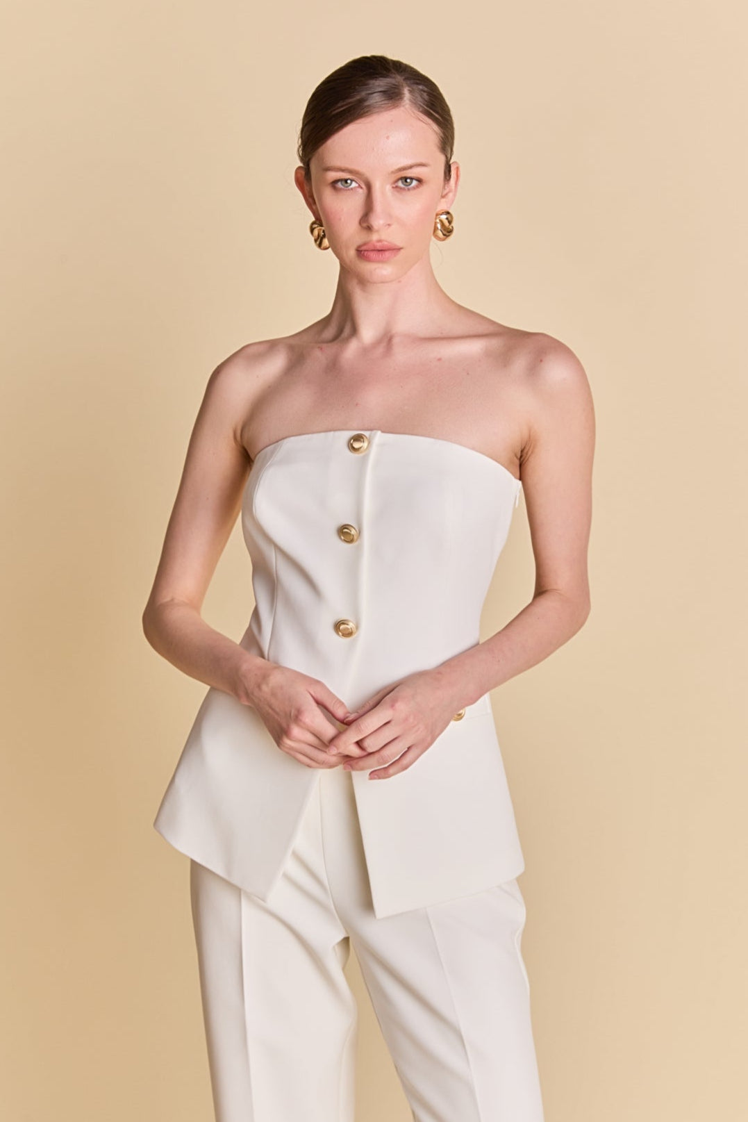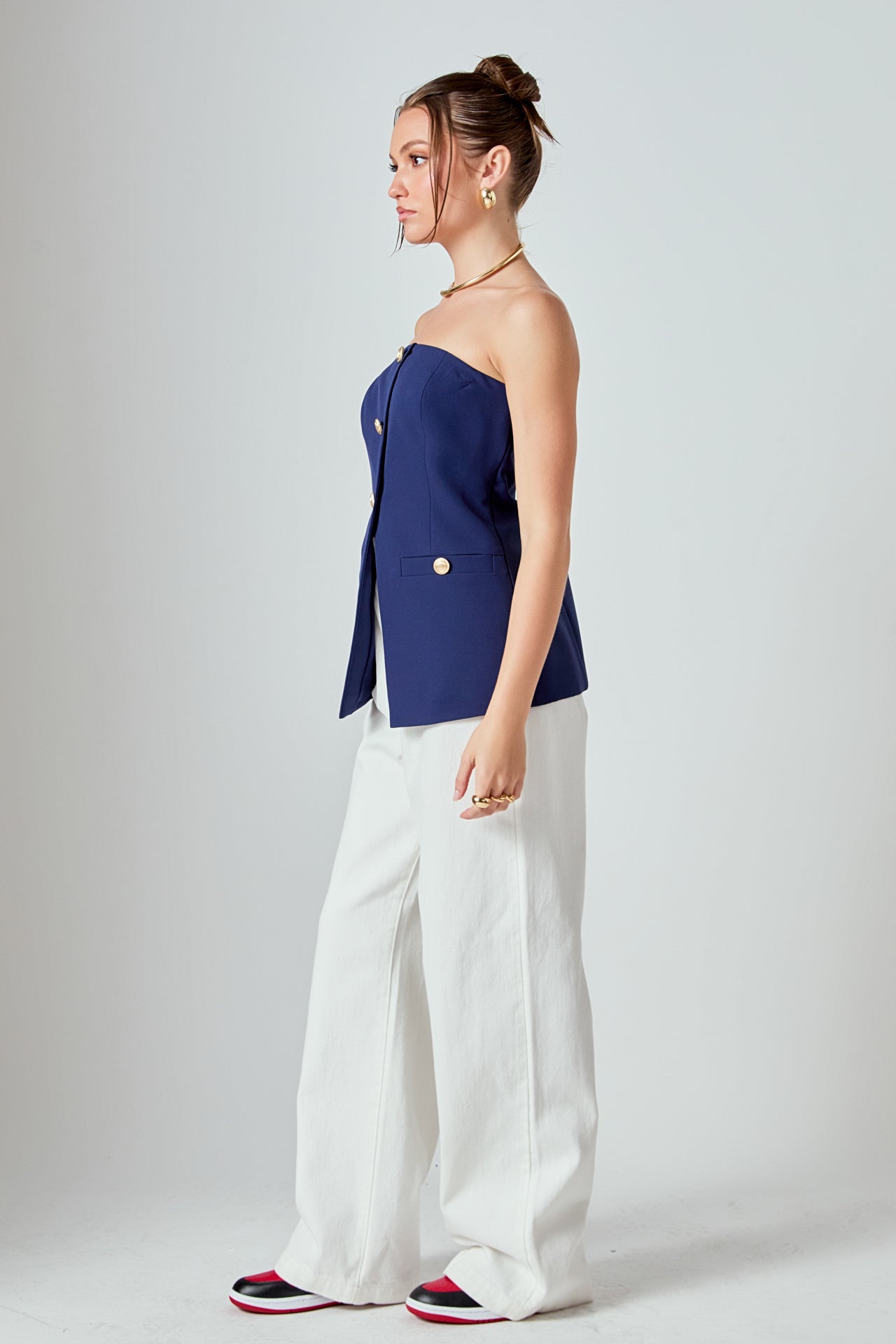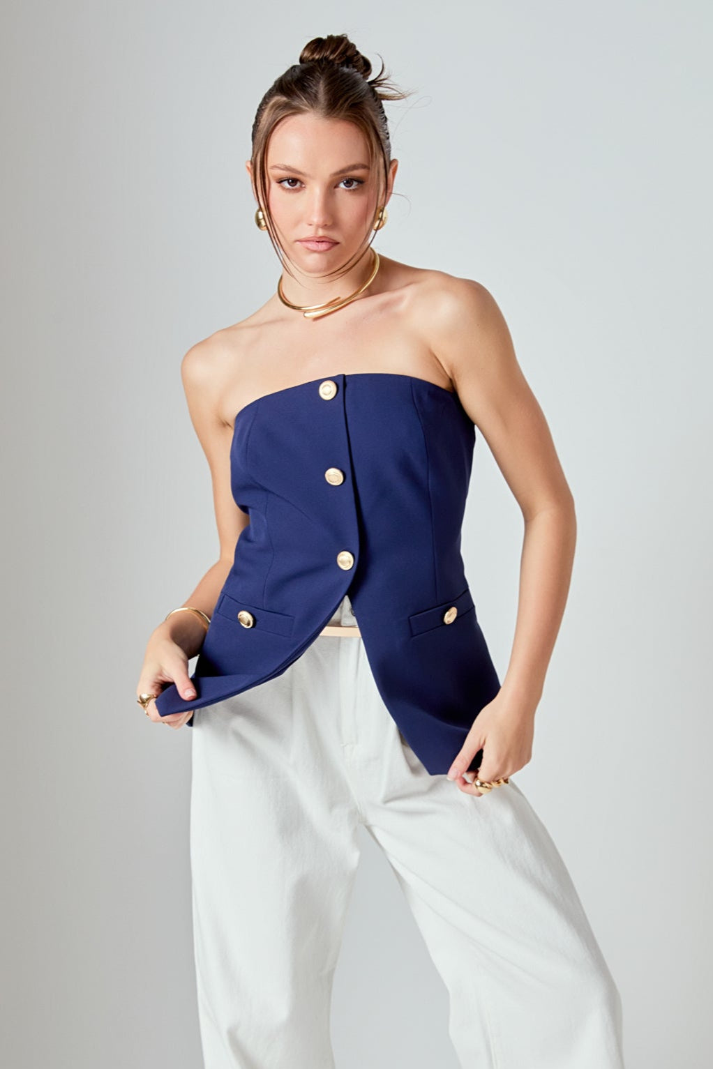 Introducing our must-have Strapless Suit Long Top, a versatile addition to your wardrobe. The trendy strapless design exudes confidence and grace, while the long length adds an elegant touch. The front buttons add a touch of sophistication while the back zipper ensures a comfortable fit. Perfect for any occasion, wear it with jeans for a casual look or pair it with a skirt for a formal event. Don't miss out on this unique and stylish top. Upgrade your style game with our Strapless Suit Long Top today!