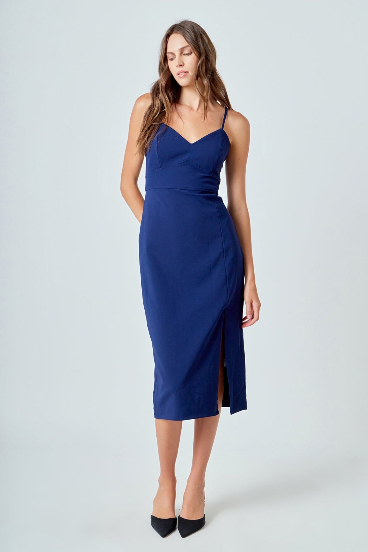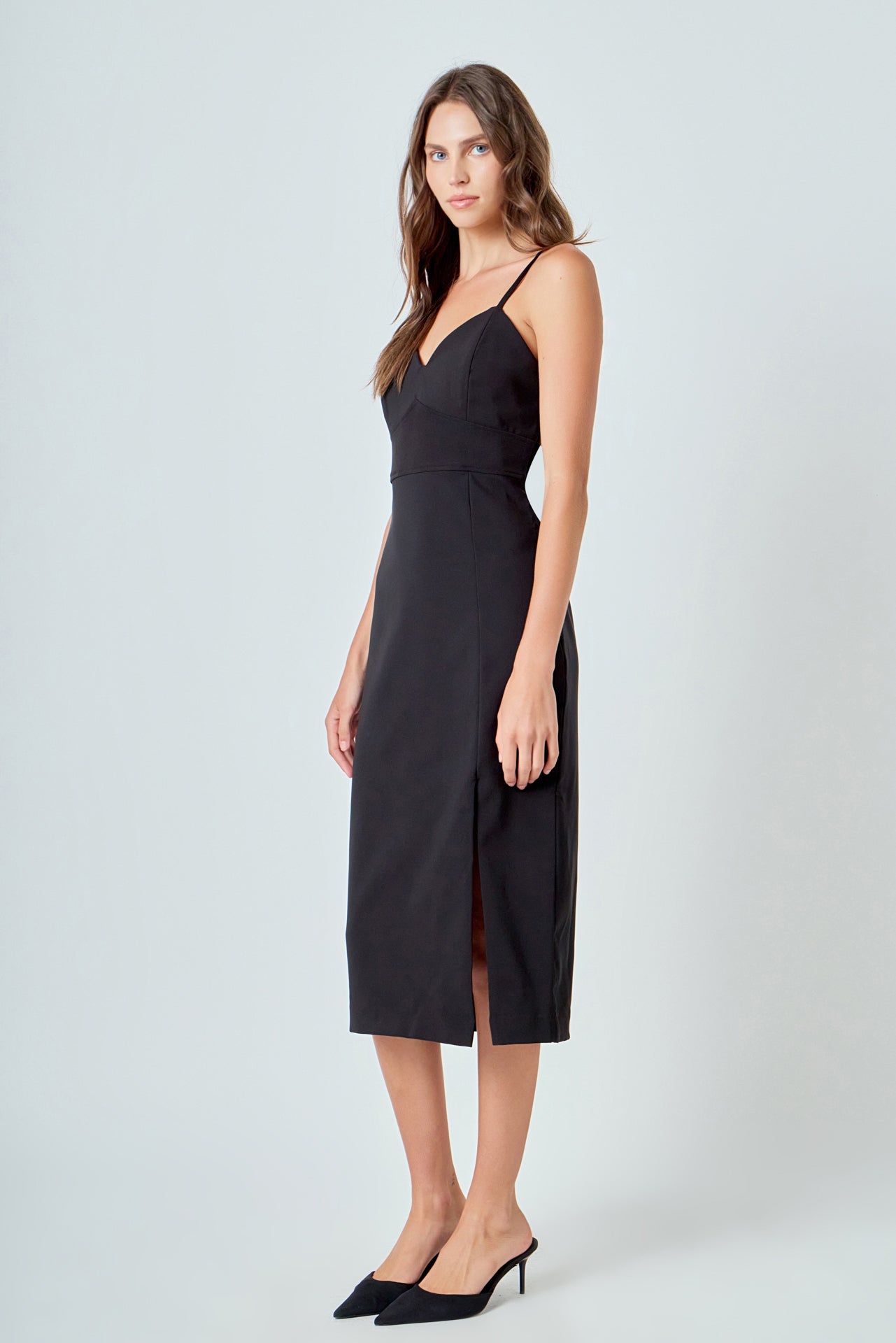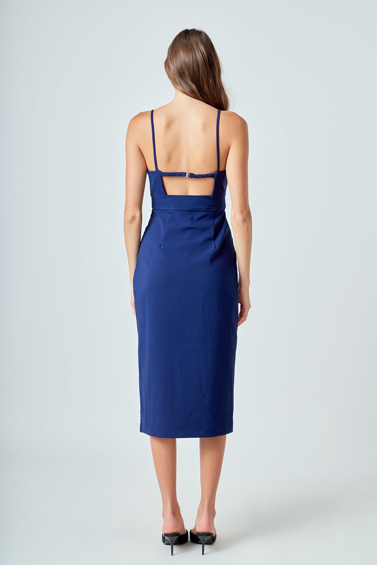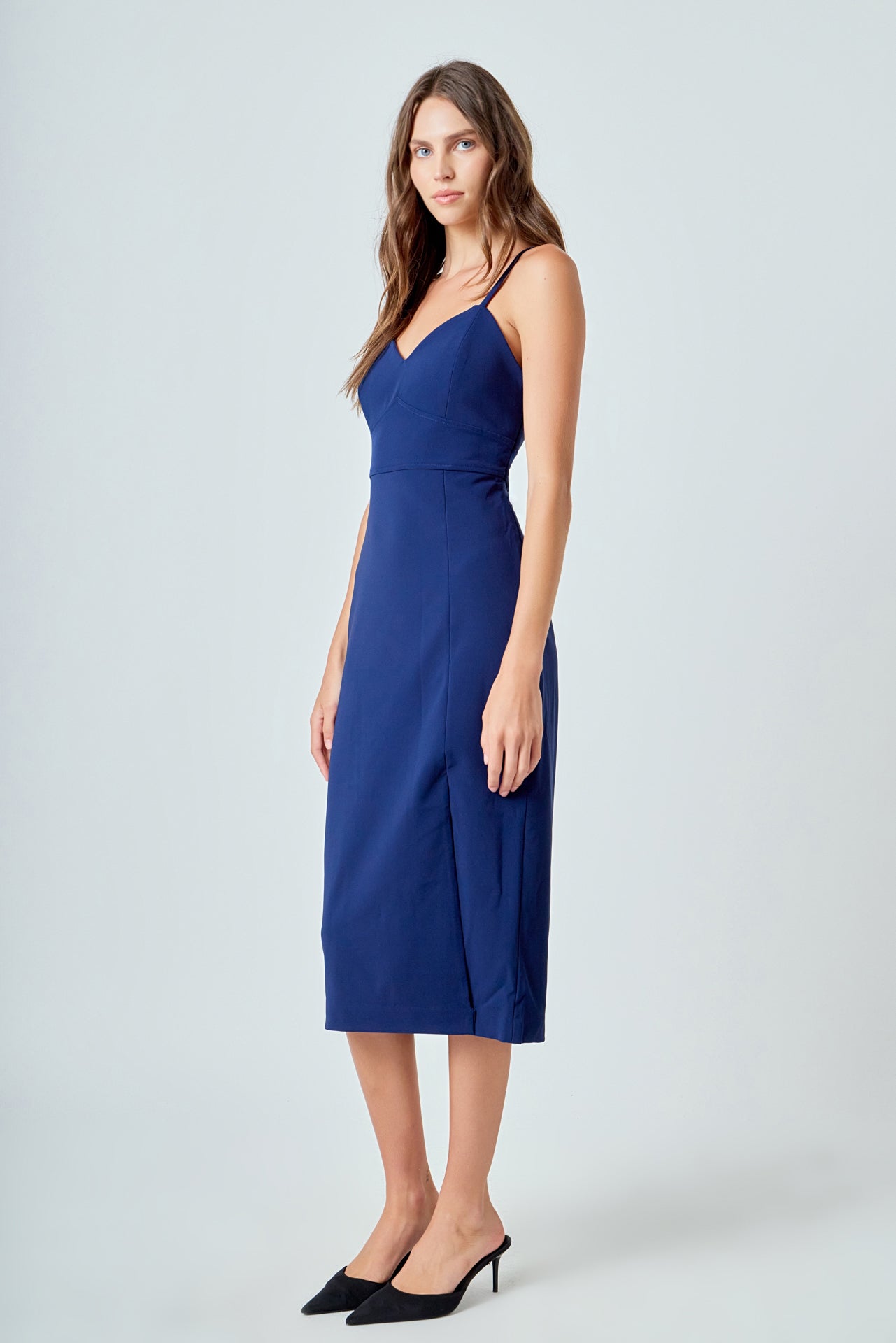 This Strappy Midi Pencil Dress exudes luxe sophistication. Crafted in a midi length sleeveless design with its pencil fit it accentuates the female form highlighting the curves whilst drawing attention to the daring v-neckline. The subtle straps add an signature designer touch. Make this statement piece your go-to for an elegant evening look.