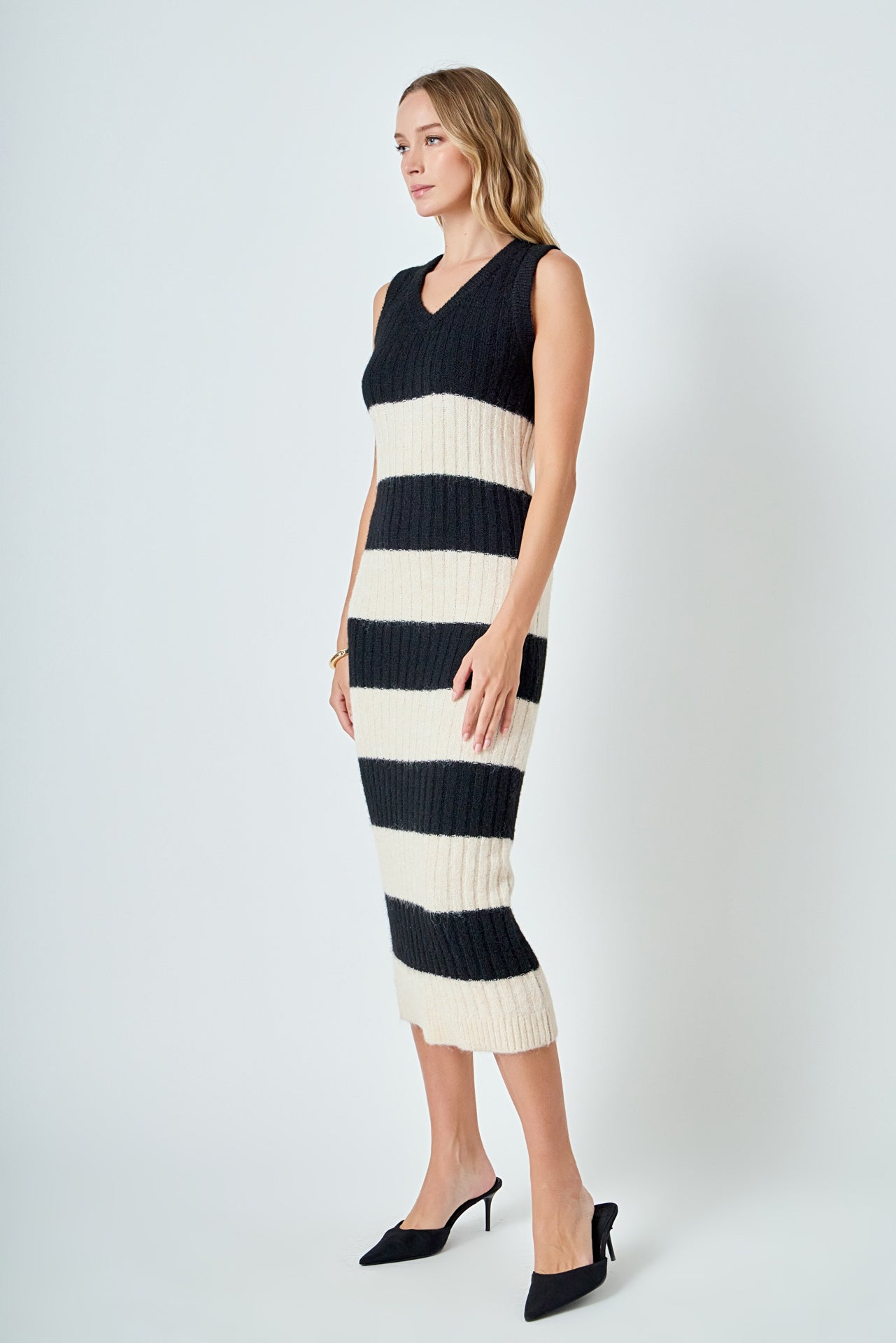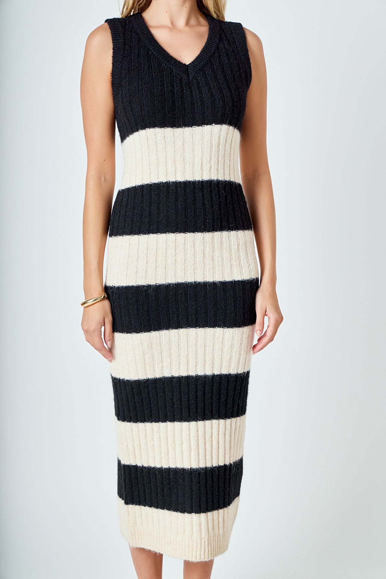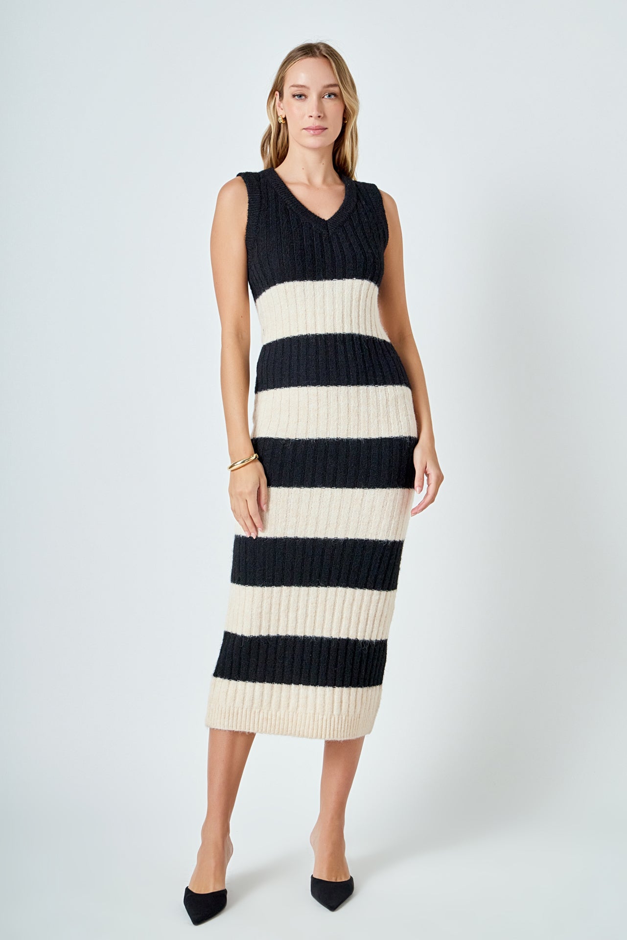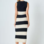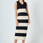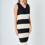 Effortlessly chic and oh-so-stylish, our Striped Knit Midi Dress is a must-have addition to your wardrobe. With its classic stripes and flattering midi length, this dress is perfect for any occasion. The sleeveless design and v-neckline add a touch of sophistication, while the soft knit fabric ensures comfort all day long. Pair it with your favorite heels and statement jewelry for a stylish look that will turn heads. Whether you're heading to the office or out for a night on the town, this dress will make you look and feel confident. Shop now and elevate your fashion game with our Striped Knit Midi Dress.