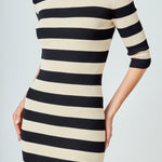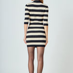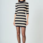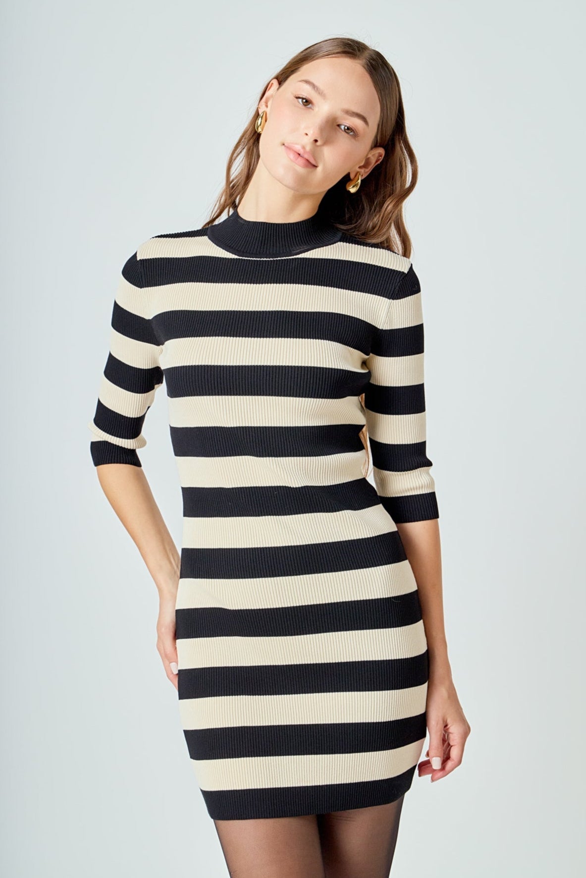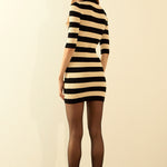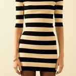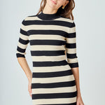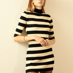 Show off your style with our Striped Knit Mini Dress - a versatile addition to your wardrobe. Made with a beautifully crafted knit fabric, this dress hugs your curves in just the right places. The classic striped design makes a statement, while the mock neck adds a touch of sophistication. Half sleeves ensure comfort and a perfect fit, perfect for any occasion. Whether you're dressing up or keeping it casual, this dress is sure to turn heads. Shop now and elevate your fashion game with our must-have Striped Knit Mini Dress.