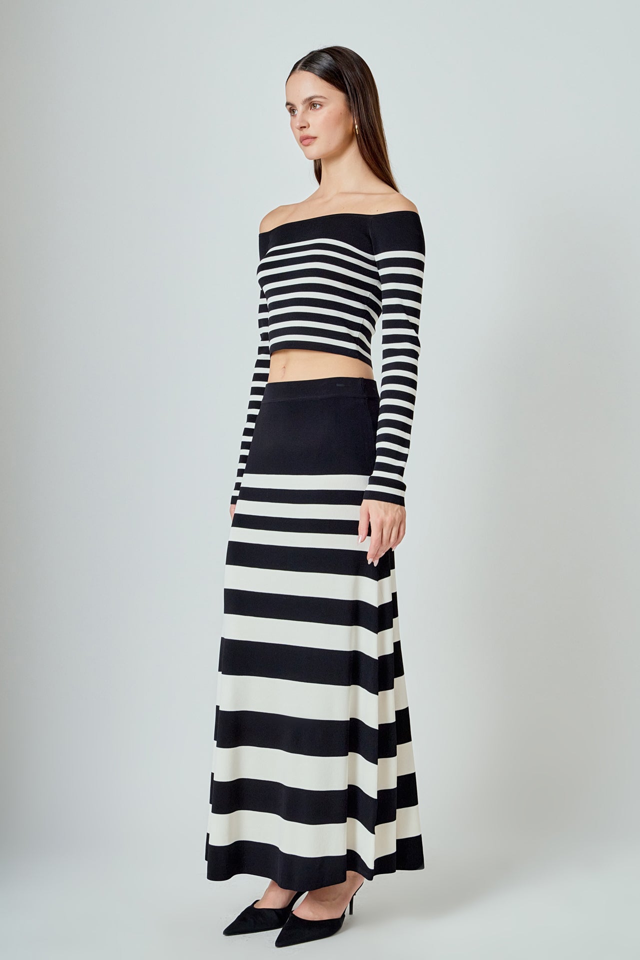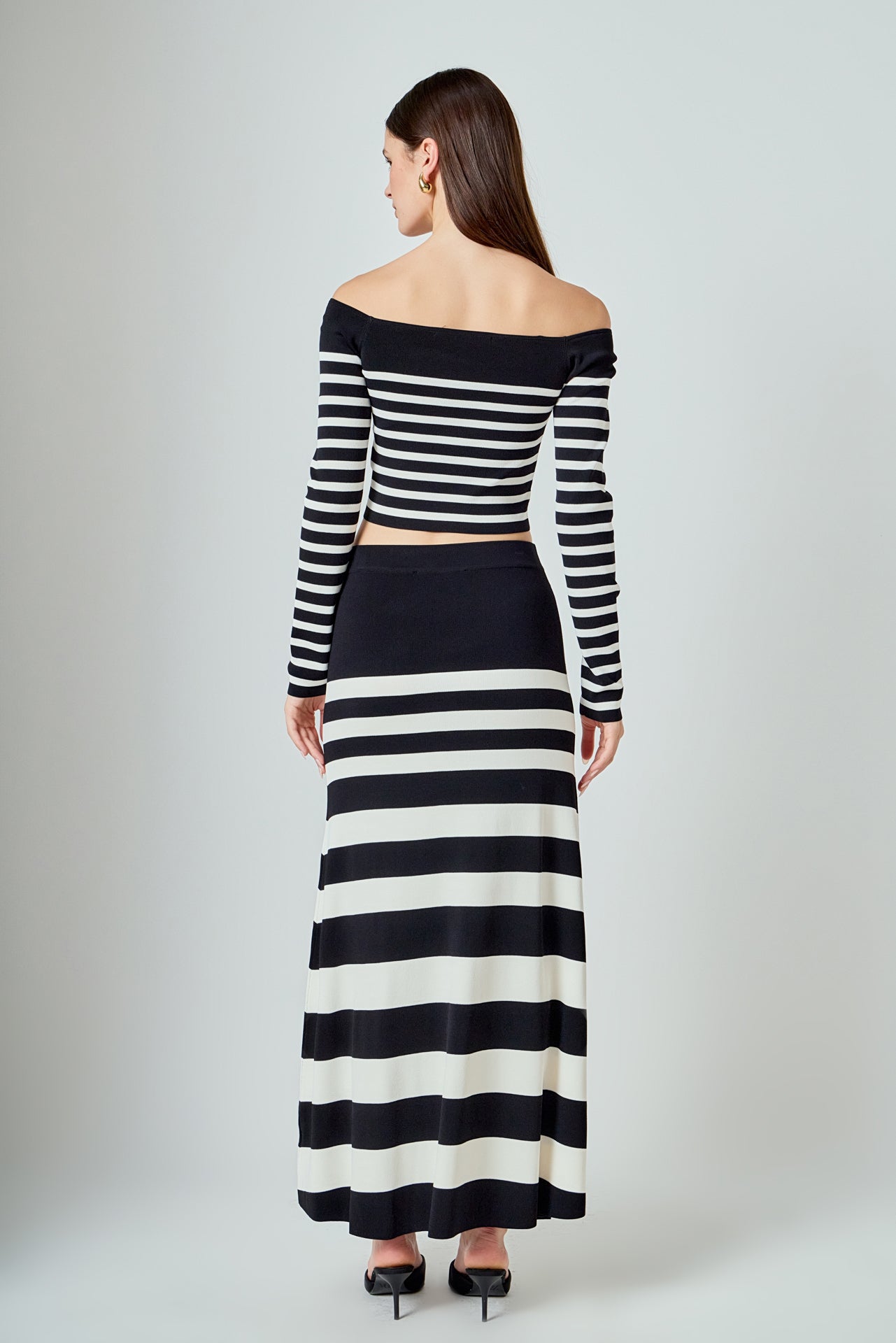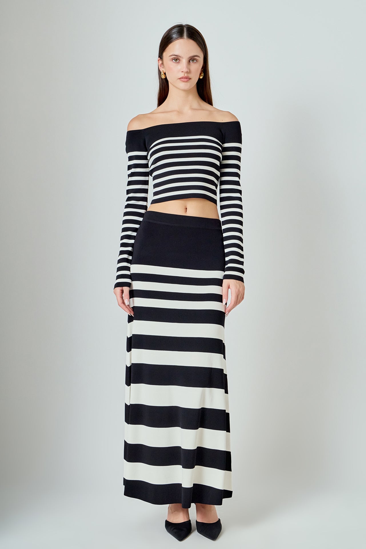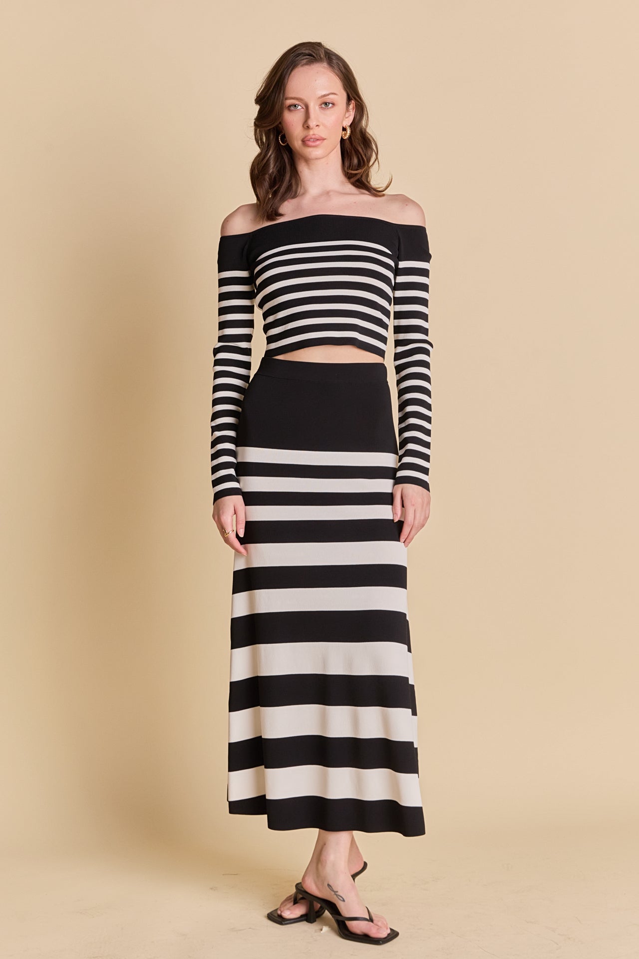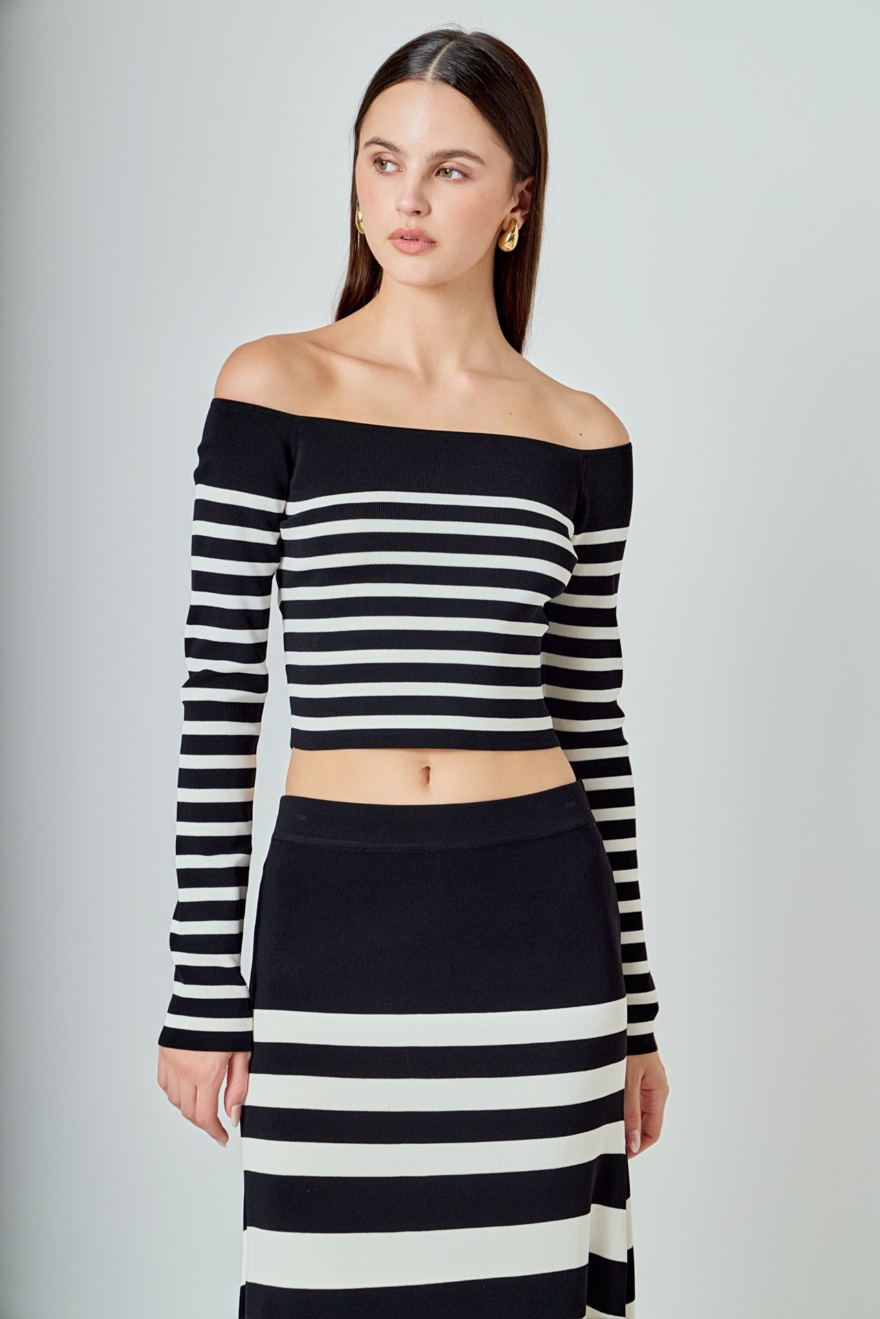 Introducing our latest must-have top - the Striped Knit Off Shoulder Sweater. Made from high-quality knit material, this top brings both comfort and style to your wardrobe. Featuring an alluring off shoulder design, long sleeves, and a cropped silhouette, it's the perfect balance of chic and trendy. The classic striped pattern adds a touch of sophistication to this versatile piece. Wear it with high-waisted jeans or a skirt for a day-to-night look. Elevate your wardrobe with this irresistible and on-trend knit off shoulder sweater. Shop now and experience effortless style.