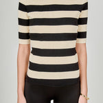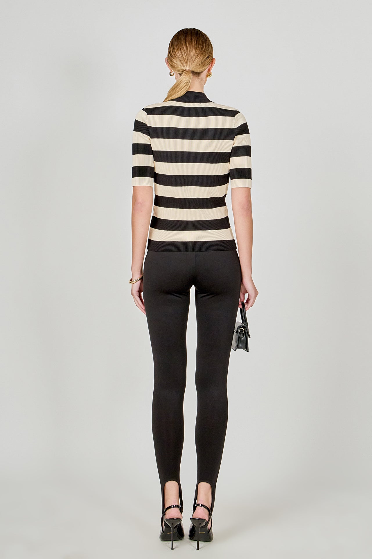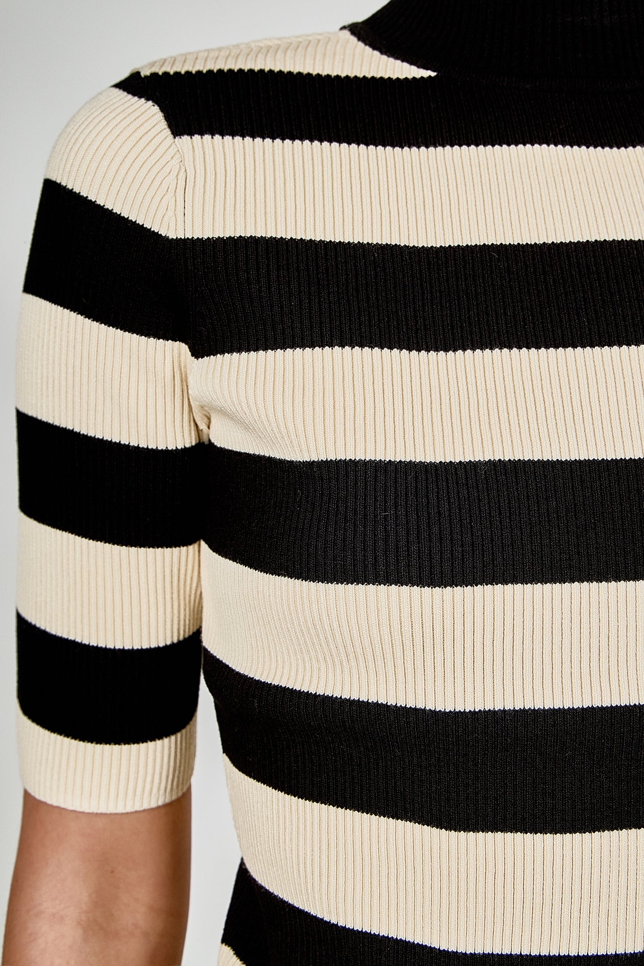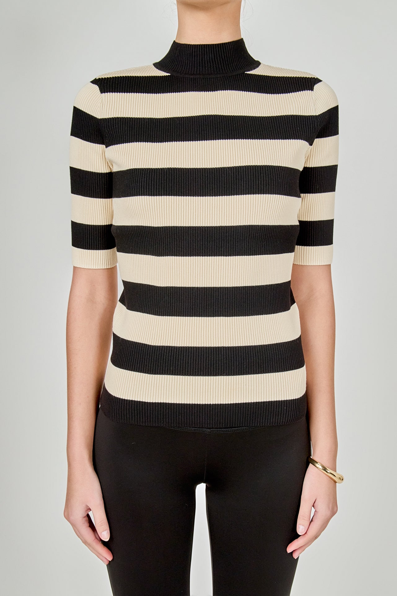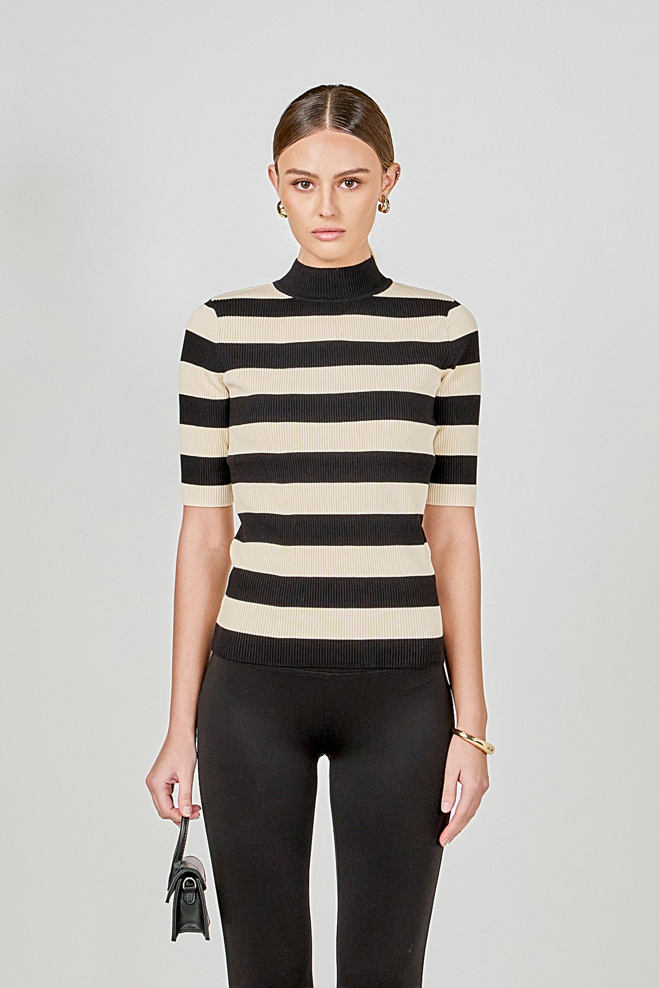 Introducing our latest Striped Knit Top the perfect addition to your collection of sweaters & knits! Featuring a classic Stripe design and Knit fabrication for a chic and cozy look. The Mock neck adds a touch of sophistication while the Fitted silhouette flatters your figure. This top is a must-have for any fashionista. Made with high-quality materials it ensures both comfort and style. Perfect for both casual and dressy occasions it is a versatile piece that can be easily dressed up or down. Stand out from the crowd and grab yours today!