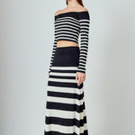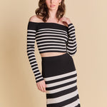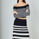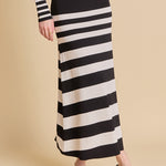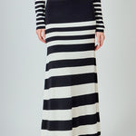 Step into style with our Striped Midi Skirt. The flattering fit and flare silhouette delivers comfort and definition, while the knit fabric offers a soft and lightweight feel. Its midi length adds a touch of sophistication, perfect for both casual and formal occasions. With classic stripes that add a timeless charm to your wardrobe, this skirt is versatile and easy to style. Shop now and make a fashion statement with ease.