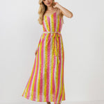 Make a statement in our Striped Sequin Maxi Dress. With a vibrant striped sequin fabric, this dress is sure to turn heads. The lining ensures you're extremely comfortable, and the matching belt gives you the option to cinch in the dress and show off your curves.