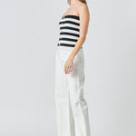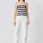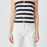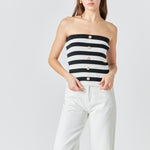 Get ready to turn heads with our stunning Striped Strapless Top. This must-have top is both stylish and versatile, perfect for any occasion. Made with a soft and comfortable knit fabric, this top features a classic stripe pattern and a trendy strapless design. The button down front adds a touch of elegance, making it a standout piece in your wardrobe. Dress it up with a flowy skirt or keep it casual with your favorite pair of jeans. It's a must-have for any fashion-forward closet. Order now to add this versatile Striped Strapless Top to your collection!