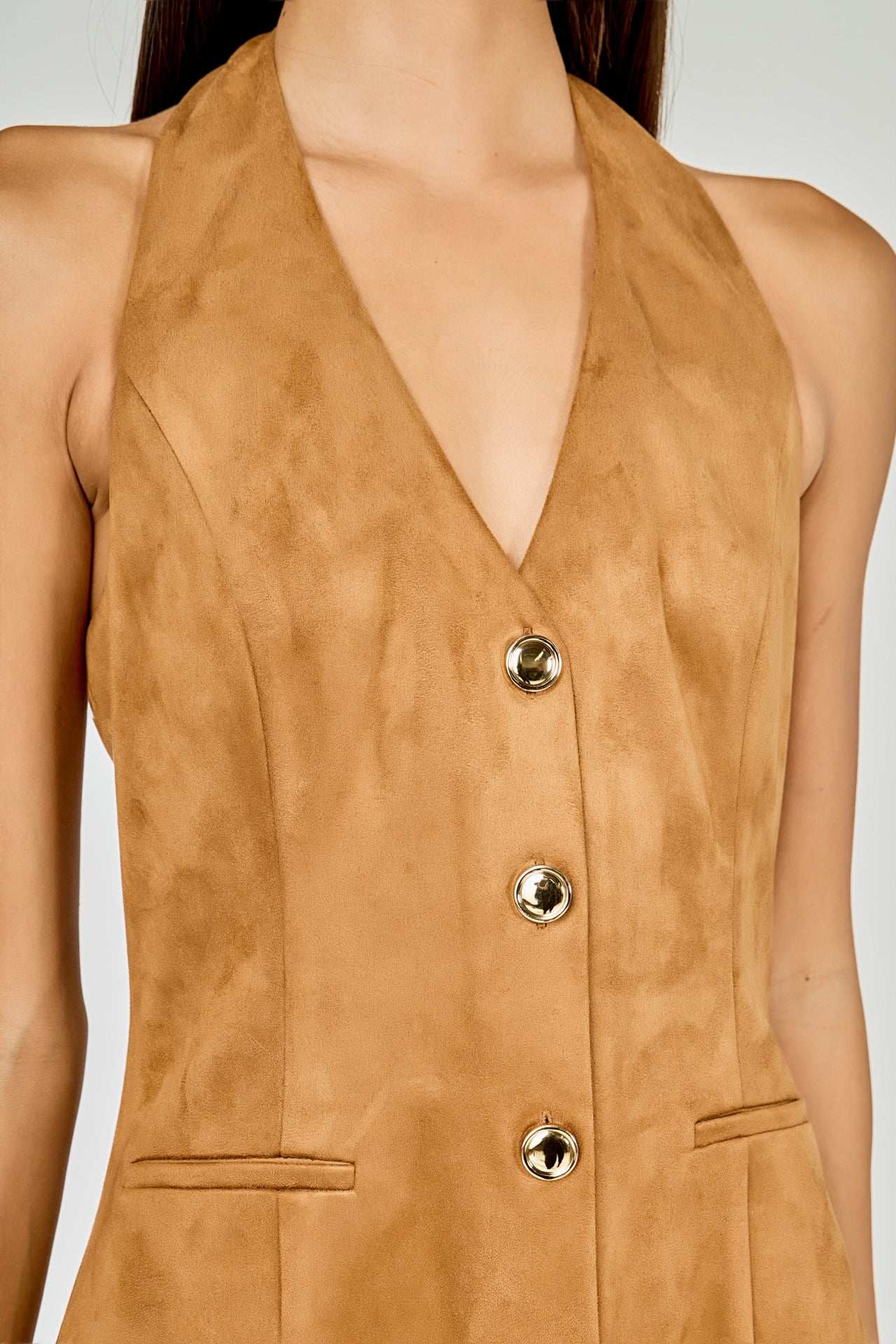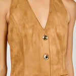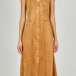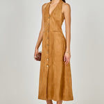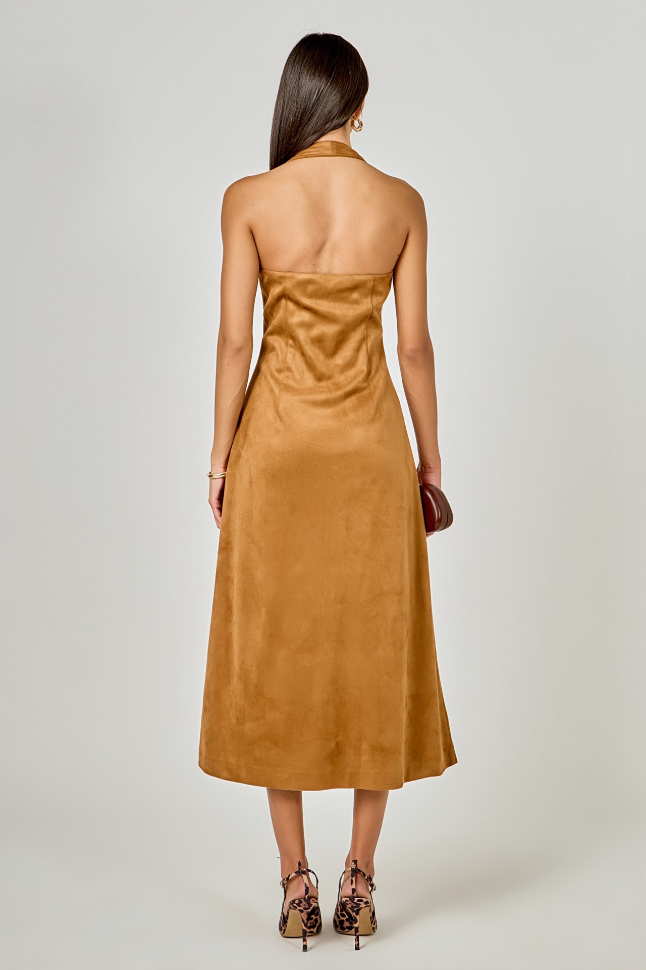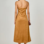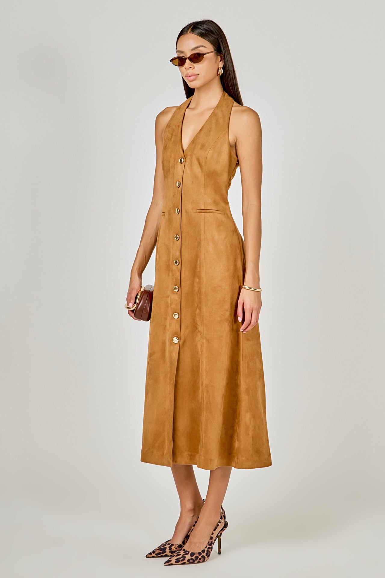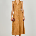 Our Suede Fitted Midi Dress is a sleek and sophisticated wardrobe staple. Made from soft suede, it features a fitted silhouette, halter neckline, and subtle front button detail. The midi length makes it perfect for evenings out or special occasions, while the minimalist design keeps it versatile and timeless. Comfortable yet striking, it’s a wardrobe essential.