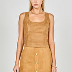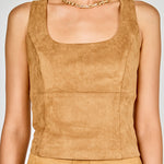 Introducing our must-have Suede Scoop Neck Top, crafted from luxurious suede fabric. The scoop neckline adds a feminine touch while the sleeveless design keeps you cool and comfortable. The fitted silhouette hugs your curves in all the right places, creating a flattering look that's perfect for any occasion. Elevate your wardrobe with this versatile and trendy top, available in a range of classic and chic colors. Add a touch of sophistication to your outfit with our Suede Scoop Neck Top.