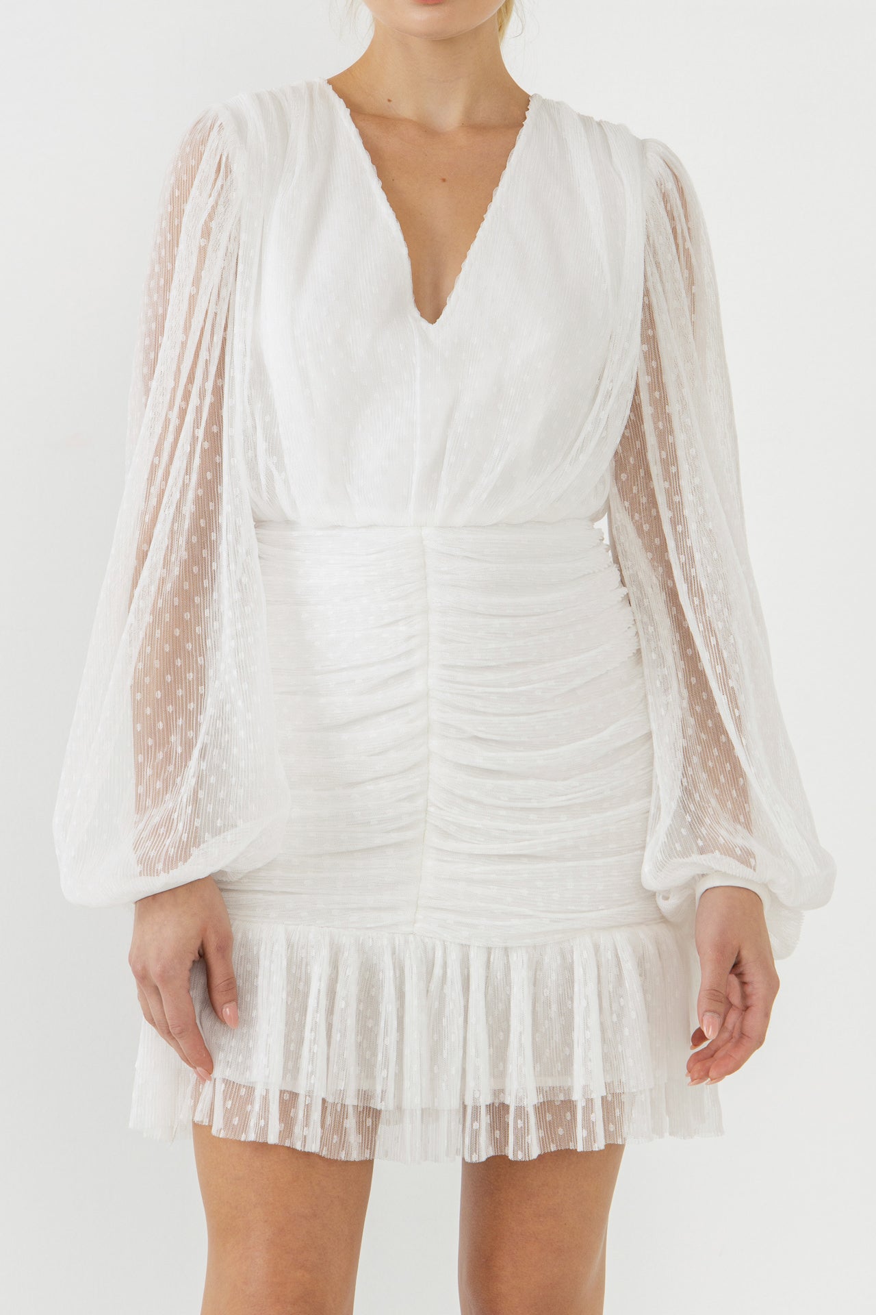 This breathtaking dress is perfect for any woman who wants to feel confident and fabulous. The Swiss dot mesh overlay is adorned with delicate long sleeves, ruched lower bodice, and a V neckline. The back zipper and lining make it easy to slip on and off, and the ruching in the lower bodice is figure-flattering. Whether you're attending a wedding or a black-tie event, this dress is sure to make you feel like the belle of the ball.