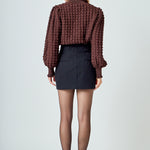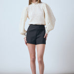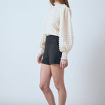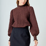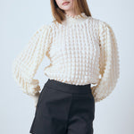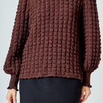 An elegant blouse that you can wear to work and then to date night. The unique textured fabric will catch your eye with this piece. You'll also admire the blouson sleeves and mock neck that create a graceful style. Pair this mock neck top with trousers for work and then tuck it into a mini skirt for date night.