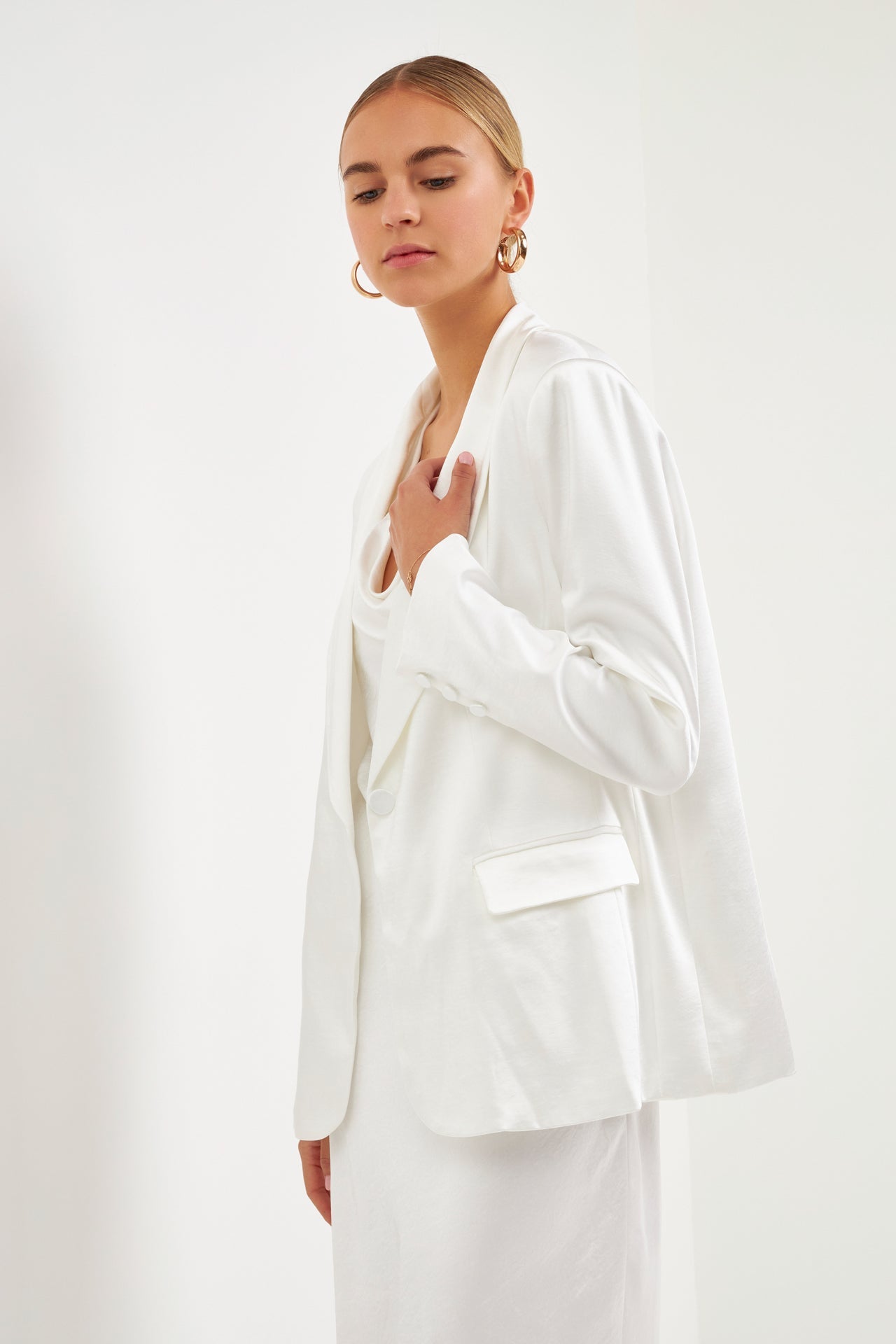 Elevate your style and step up your game with this blazer. With its sleek and shiny satin finish, this blazer is perfect for making a statement. It features a shawl collar, single button closure and welt pockets with flap. Plus, it's machine-washable so you can keep it looking fresh all year long. Whether you're dressing up for a formal event or just want to add a touch of sophistication to your everyday look, this blazer is the perfect choice.