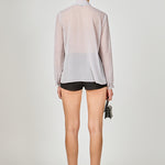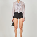 - Tied high collar