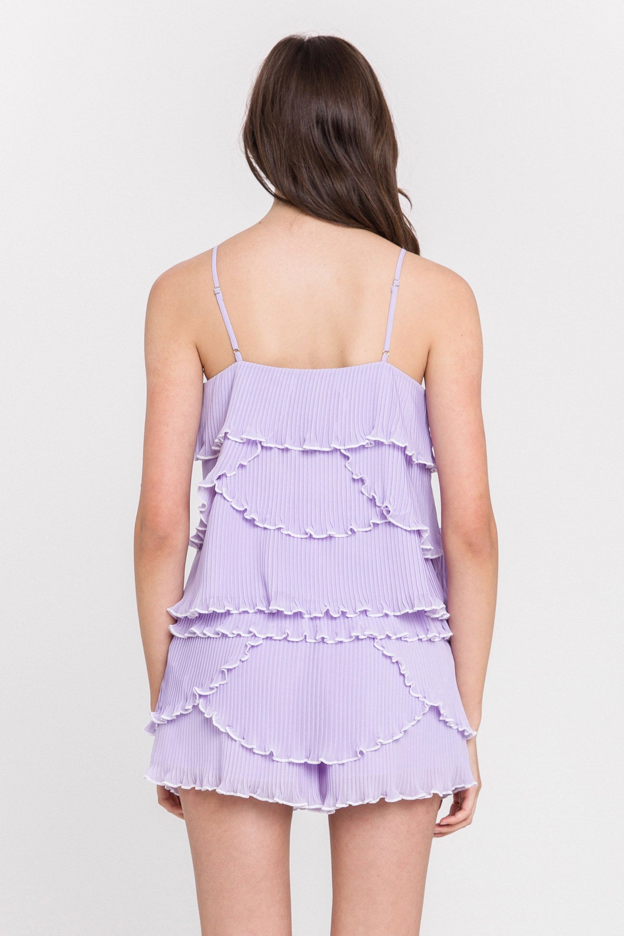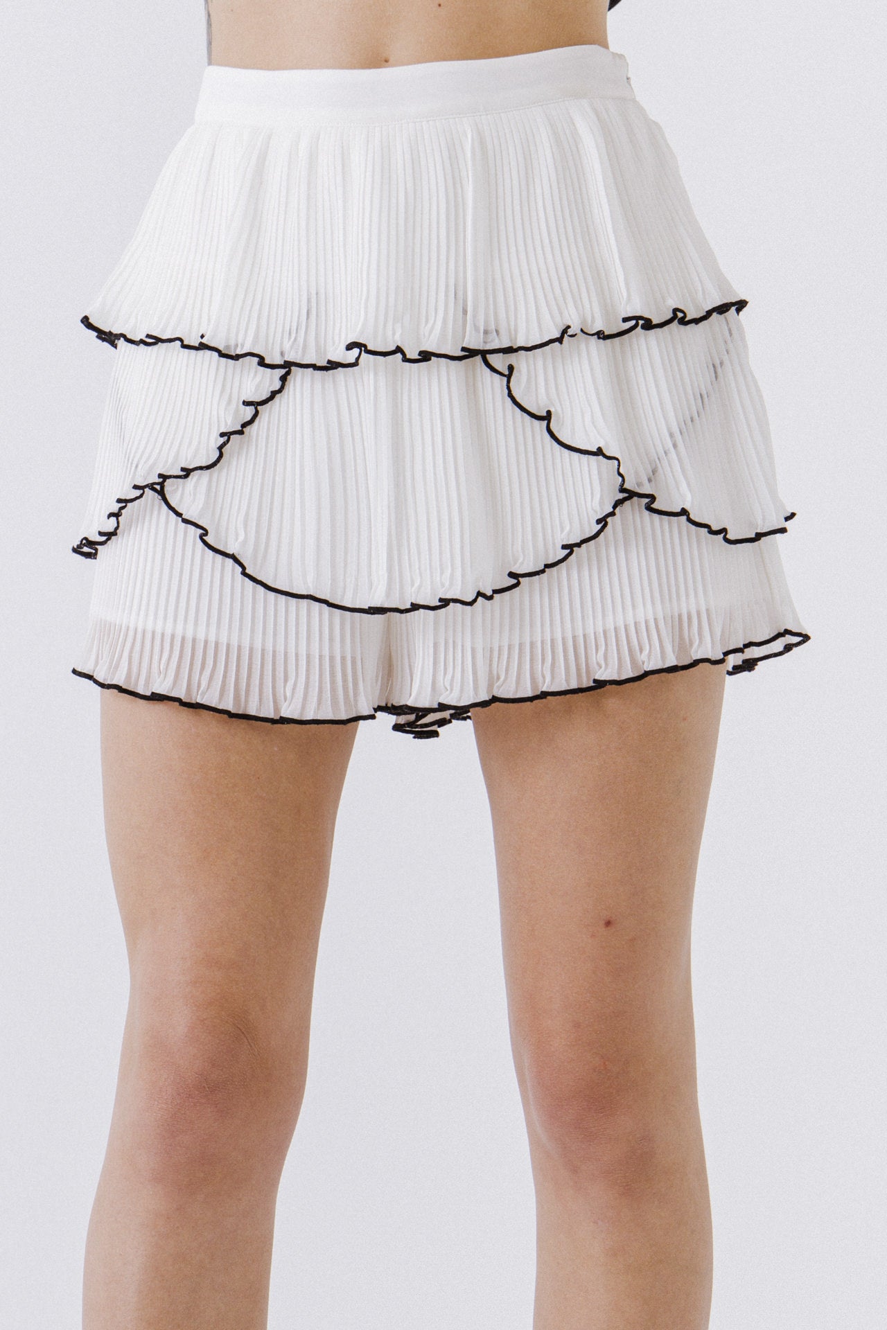 Unleash your inner fashionista with our Tiered Ruffle Shorts. Made of high-quality fabric, these shorts feature unique allover sunburst pleating and tiered ruffles for an eye-catching look. The contrasting merrow stitch adds a touch of sophistication, while the invisible side zipper ensures a seamless fit. These versatile shorts can be dressed up or down, making them a must-have for any wardrobe. Don't miss out on this trendsetting piece. Perfect for summer days or a night out, our Tiered Ruffle Shorts will take your style game to the next level. Order now!