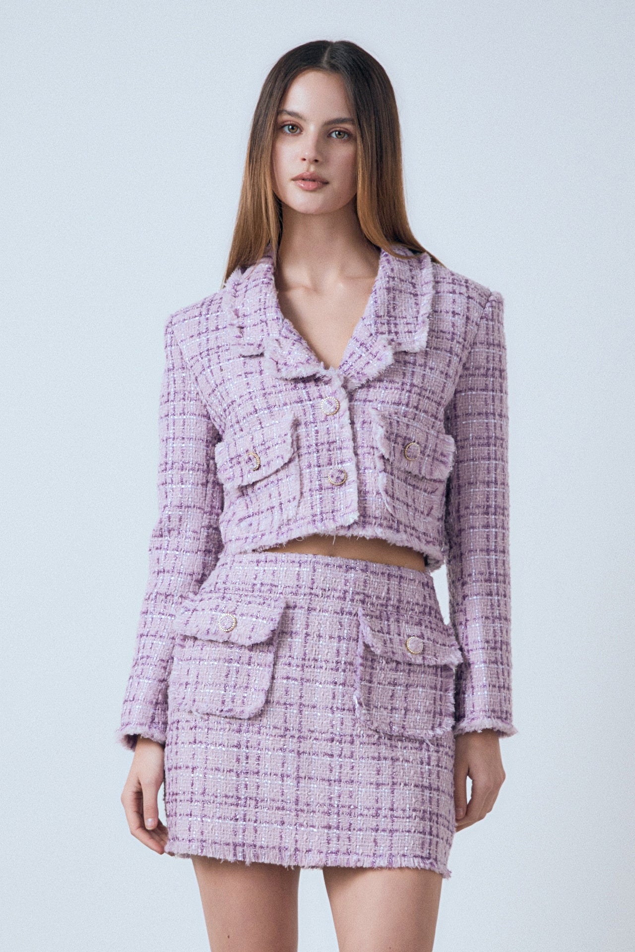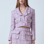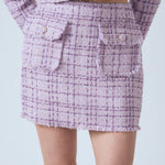 Introducing our Tonal Boucle Tweed Skirt, a timeless piece crafted from luxurious tweed fabric. The mini length and flap pocket detailing create the perfect silhouette finished with unique buttoned detail. Perfect for a work or weekend look this timeless classic is sure to add a touch of class and sophistication to any ensemble. Add to your wardrobe now for this season's must-have item and make sure to be noticed.