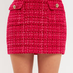 Channel your inner French girl with this stylish mini-skirt. This versatile piece can go from day to night with ease. The tweed fabric and gold accents make it perfect for dressing up or down. With a flattering fit and unique details, this skirt is sure to turn heads wherever you go.
