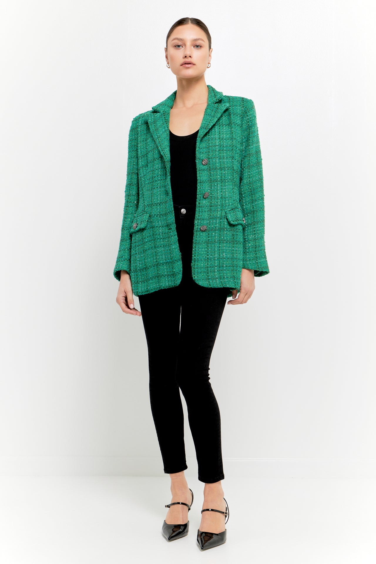 This stylish Tweed 3pc Button Long Blazer is a timeless classic for any woman. Featuring intricate buttoned collar lapel flap pocket and single-vent details it makes for an ultra-luxurious chic and elegant statement piece. Crafted from tweed fabric for a unique touch this blazer adds a dose of romance and novelty to any look making it a must-have for any modern woman's wardrobe.