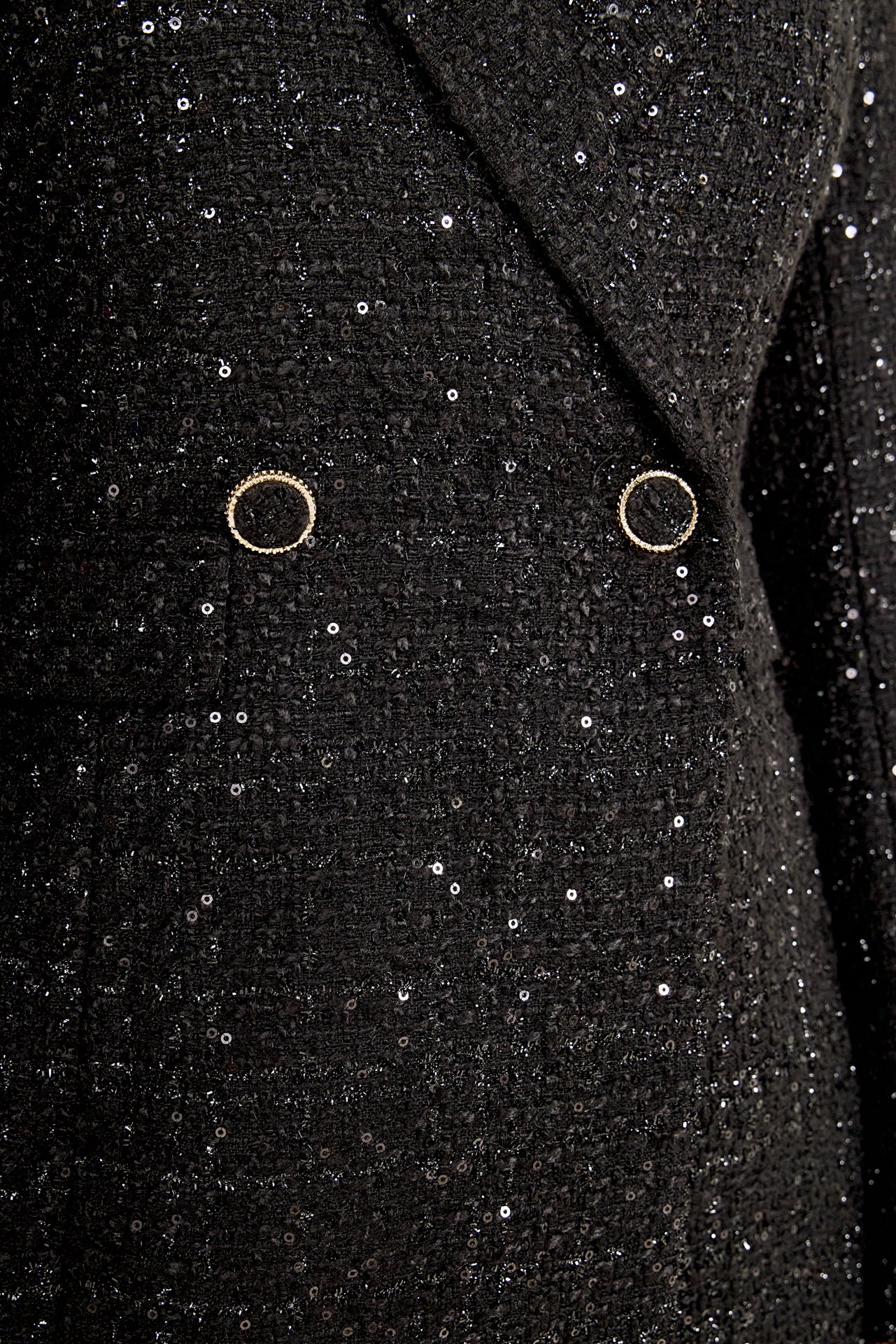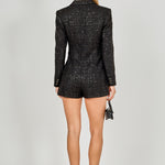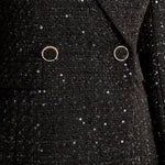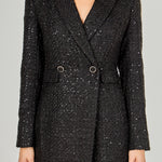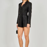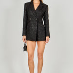Made with sequin tweed and gold-rimmed buttons, the shoulder pads and double-breasted style of this blazer romper juxtapose the otherwise feminine piece. Fully lined for comfort, this romper also has decorative pocket flaps, princess seams, and a lapel collar.