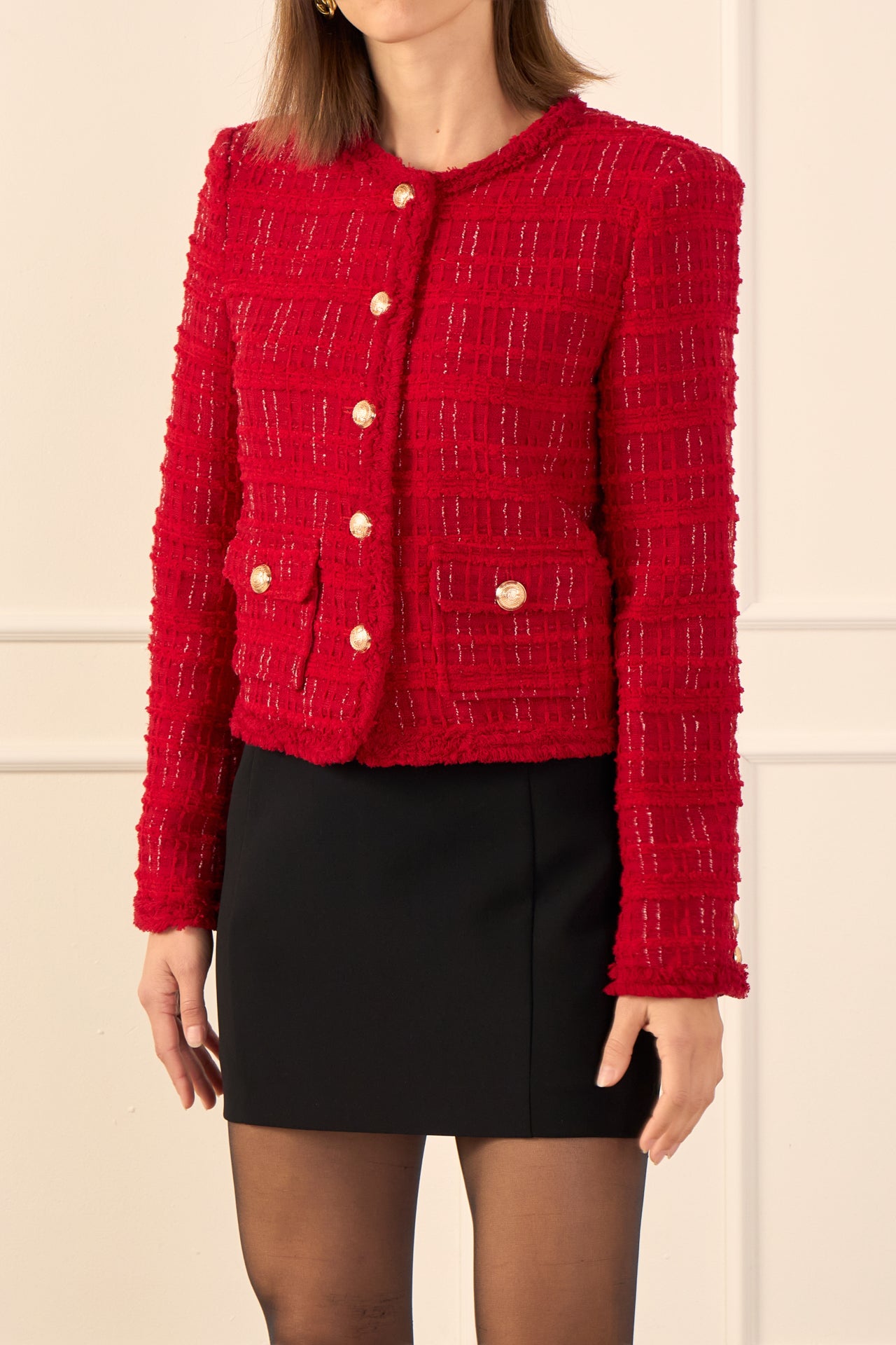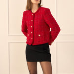 Upgrade your jacket game with our Tweed Buttoned Blazer. Made with high-quality tweed, this blazer has a timeless appeal with its classic front buttons and front pockets. The structured silhouette is further enhanced with shoulder pads, giving a sleek and polished look. Perfect for both formal and casual occasions, this blazer adds a touch of sophistication to any outfit. You'll stand out in the crowd with this must-have wardrobe staple. Shop now and elevate your style with our Tweed Buttoned Blazer.