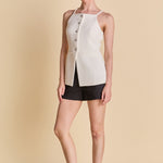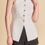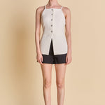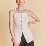 Introducing our Jacqueline Sleeveless Buttoned Tweed Top - a must-have addition to your wardrobe! Made from high-quality tweed fabric, this top exudes sophistication and elegance. The front buttons not only add a touch of vintage charm but also offer a convenient closure. The jewel buttons further elevate the overall look, making it perfect for both casual and formal occasions. The thin straps enhance the femininity of the design, while also providing a comfortable fit. With its unique blend of style and functionality, our Jacqueline Sleeveless Buttoned Tweed Top is an instant classic. Upgrade your wardrobe and make a statement with this stylish top now.