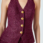 Make a statement with our Tweed Halter Vest, a modern twist on a timeless classic. Crafted from rich tweed fabric, this vest brings instant polish and sophistication to your look. The halter neckline flatters by highlighting your shoulders, while the front button closure adds both structure and style. Designed with welt pockets for a functional yet sleek finish, it's as practical as it is chic. Whether layered over a crisp blouse or worn solo for a bold, fashion-forward vibe, this versatile piece is perfect for elevating your day-to-night wardrobe. Step into effortless elegance with our Tweed Halter Vest.