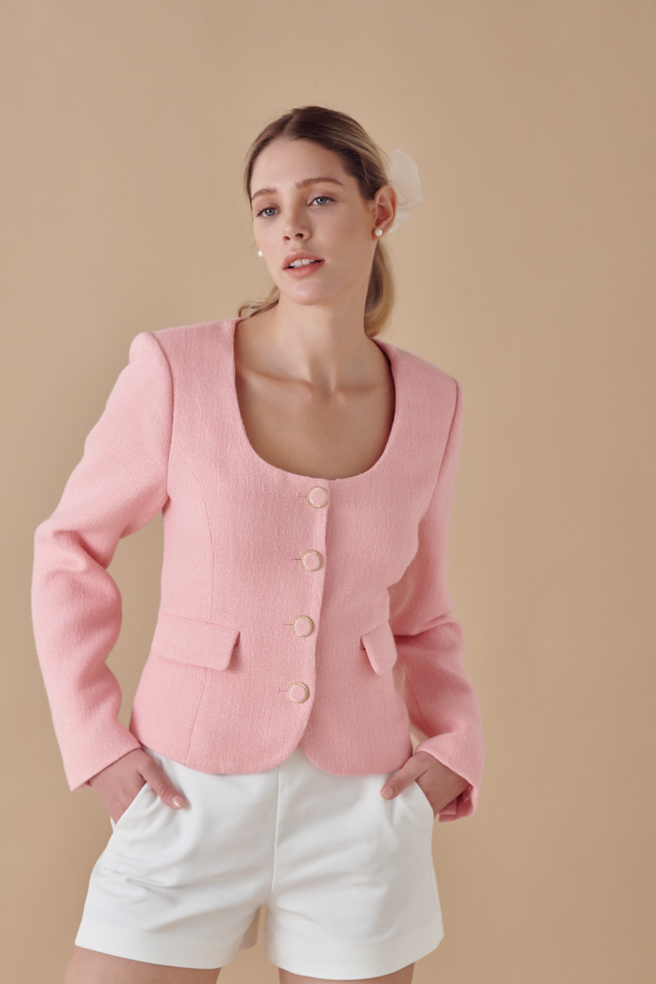 Made of medium-weight tweed this jacket has princess seams and shoulder pads which give an elevated structured fit. You can fasten the jacket with gold-rimmed tweed buttons and keep essentials in the flap pockets.