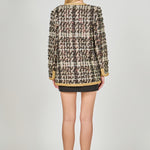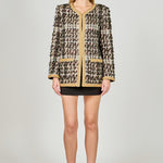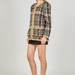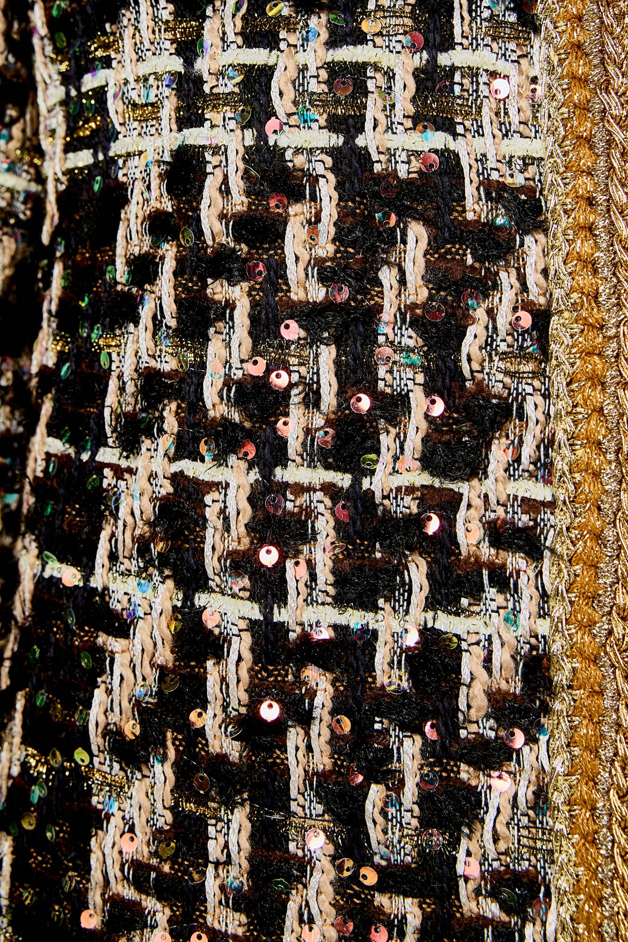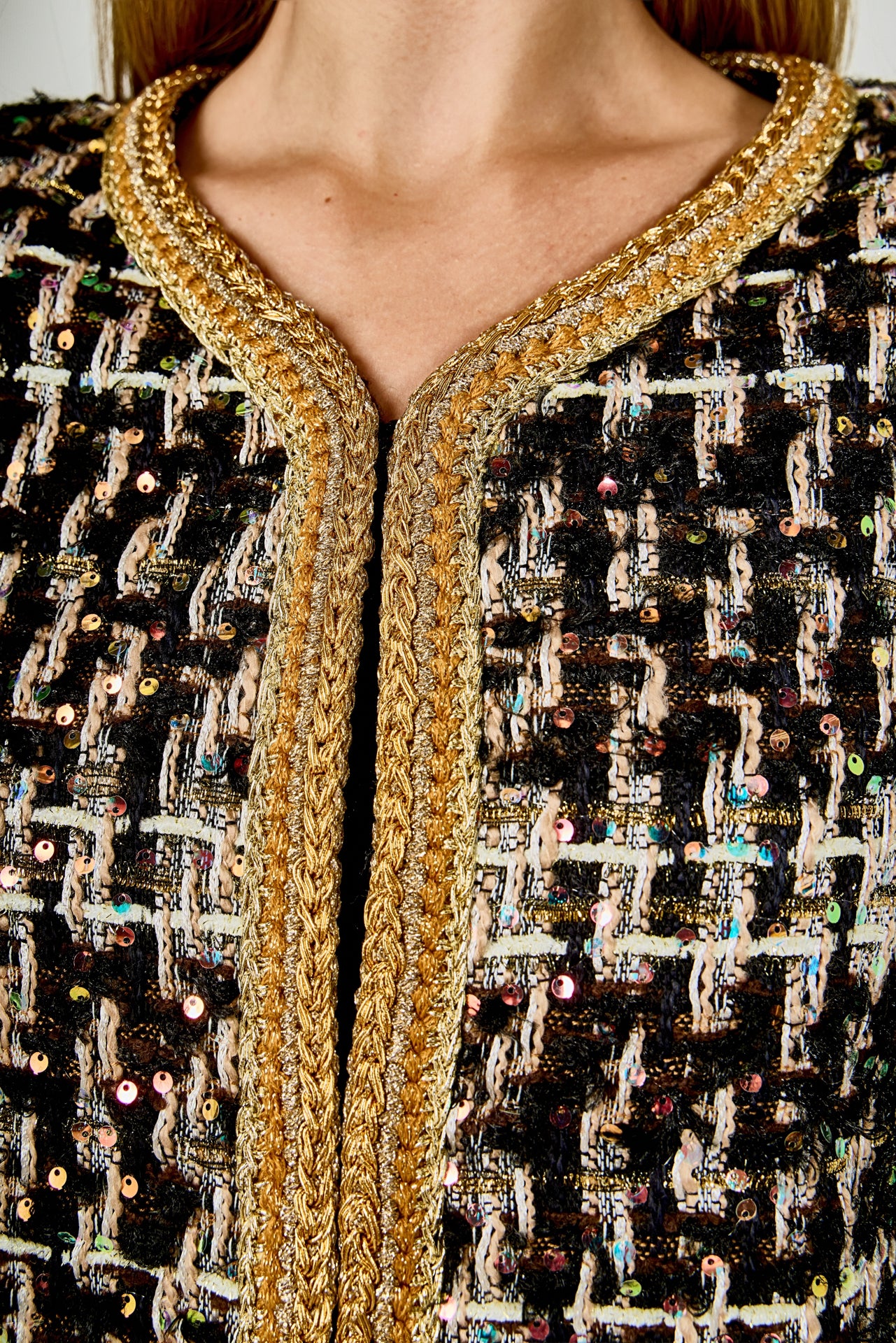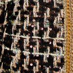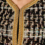 This chic tweed jacket is made of high-quality sequin tweed and features a silky satin lining to keep you comfortable. The sophisticated piece is enhanced with braided gold trim.
