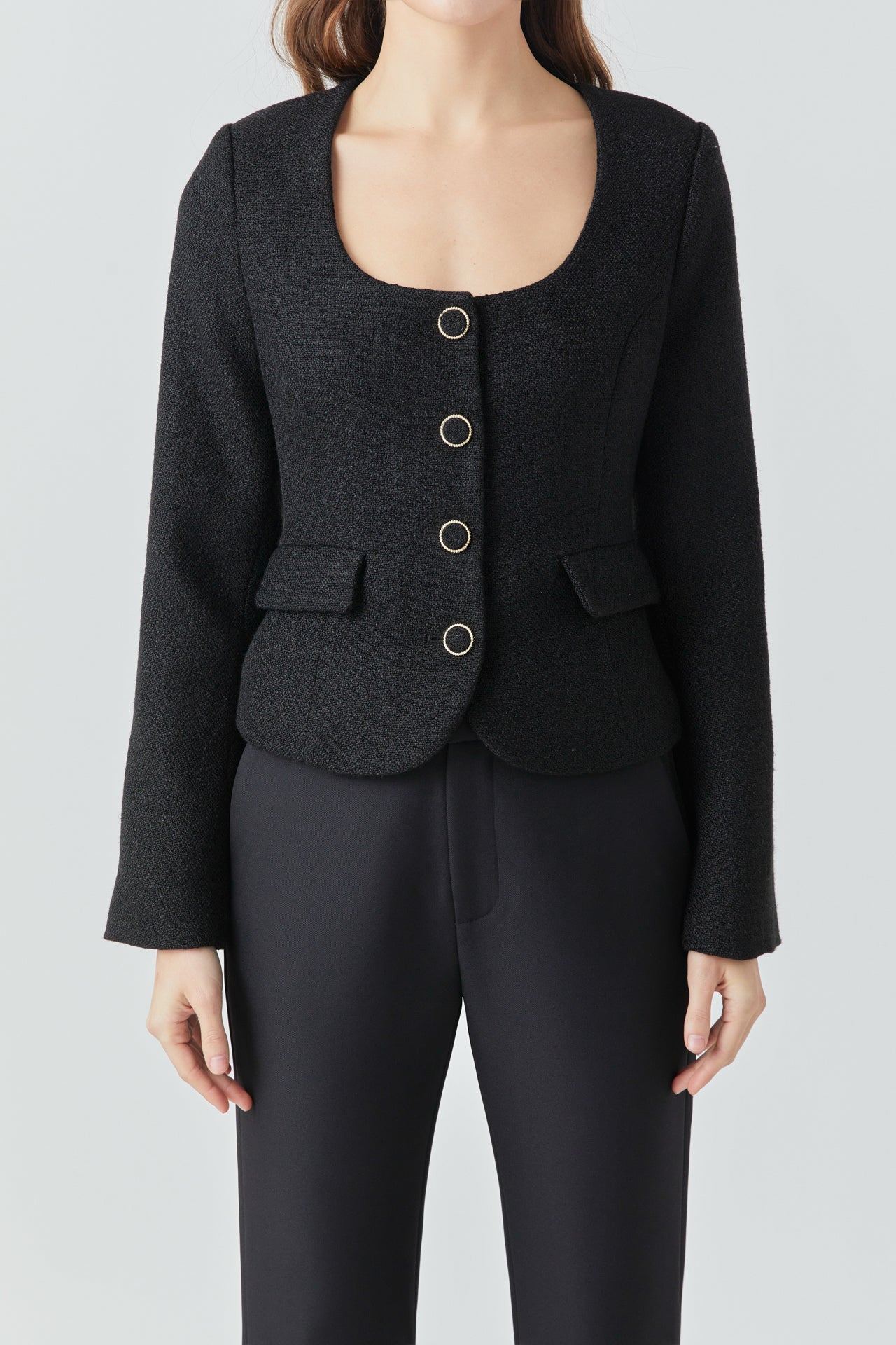 Made of medium-weight tweed this jacket has princess seams and shoulder pads which give an elevated structured fit. You can fasten the jacket with gold-rimmed tweed buttons and keep essentials in the flap pockets.