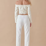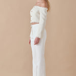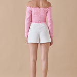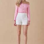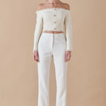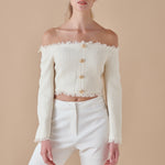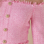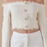 This elegant top is made with lightweight tweed and matching fringe trim. The off-the-shoulder silhouette has decorative gold buttons down the front and silicone gel along the neckline to keep it in place.