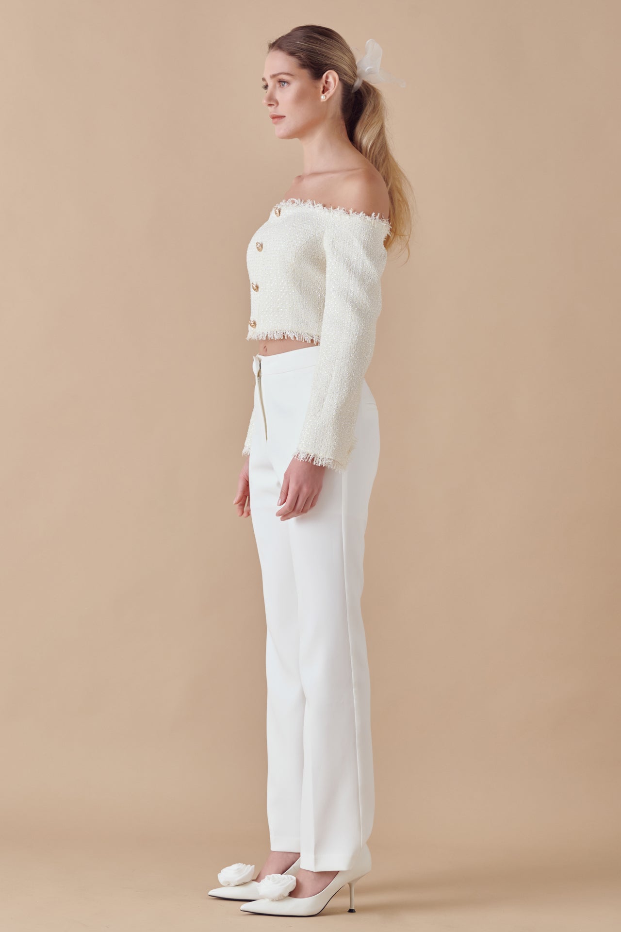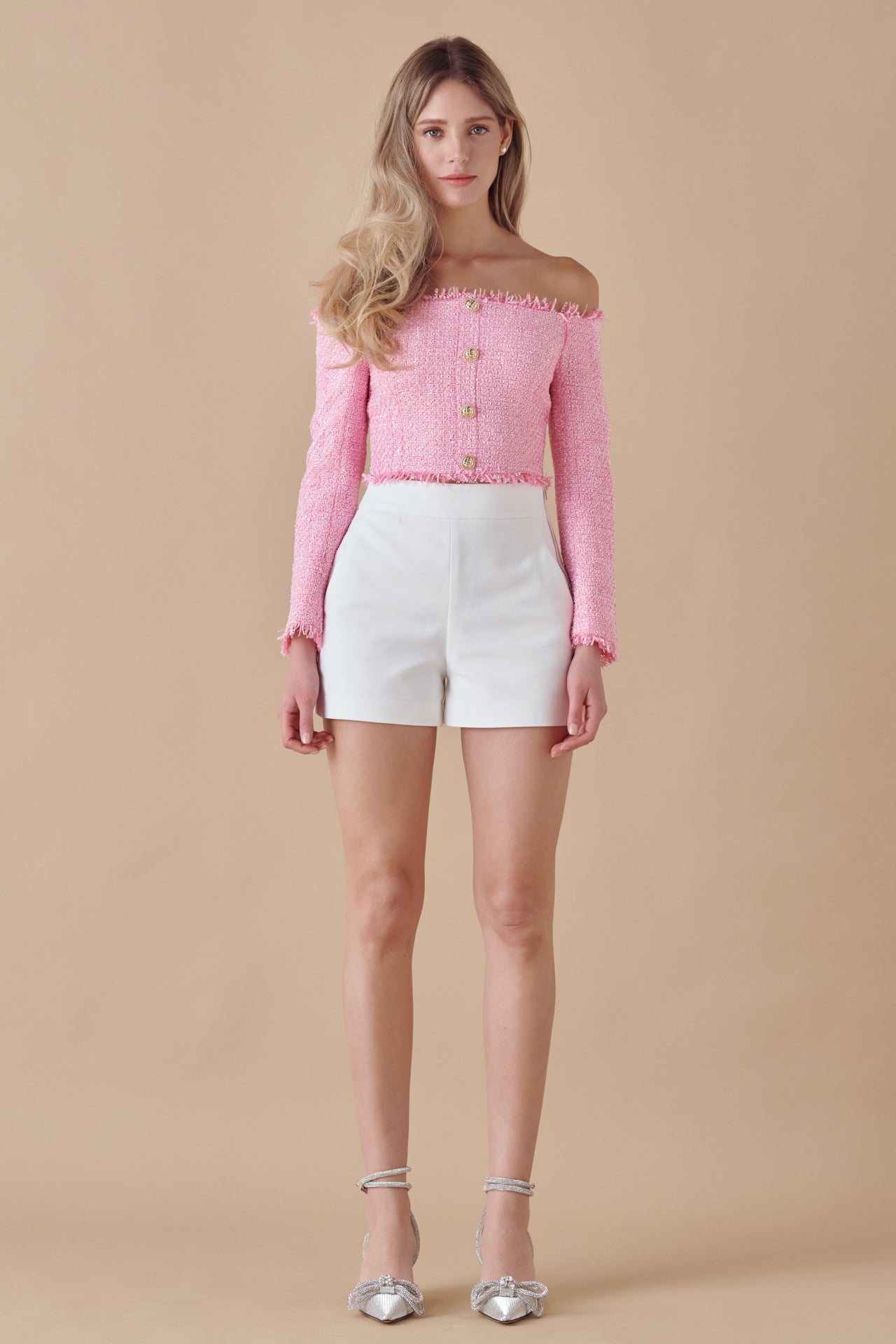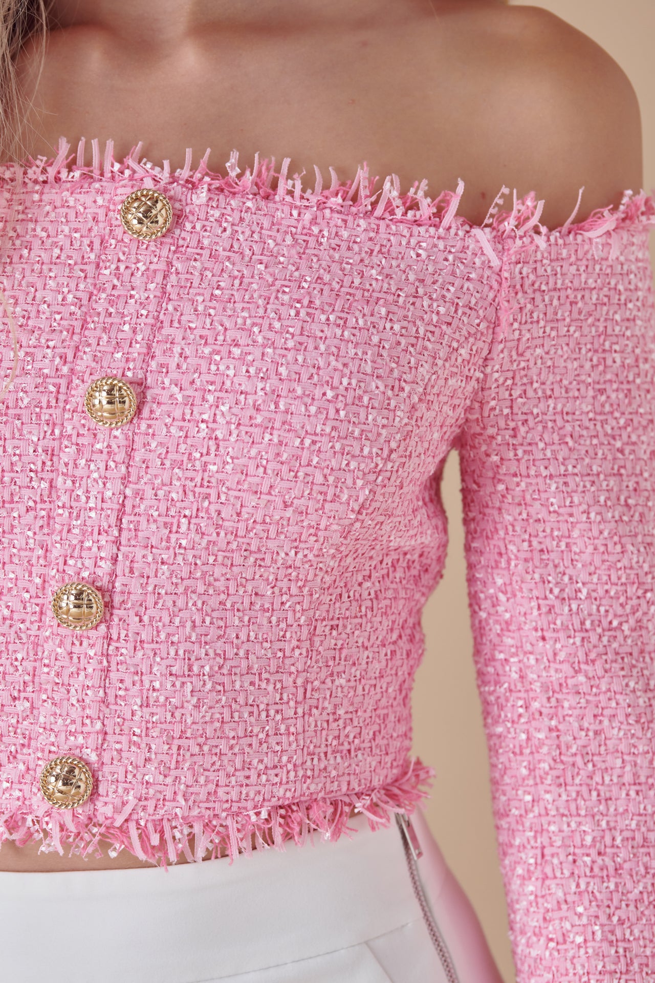 This elegant top is made with lightweight tweed and matching fringe trim. The off-the-shoulder silhouette has decorative gold buttons down the front and silicone gel along the neckline to keep it in place.
