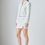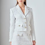Elevate your wardrobe with our trendy Tweed Short Jacket. This must-have jacket features a cropped length long sleeves and stylish shoulder pads for a sophisticated and chic look. Crafted from premium tweed fabric it offers a comfortable fit and adds texture to any outfit. Perfect for both casual and formal occasions this jacket is a versatile addition to your collection. Upgrade your style game with our Tweed Short Jacket and make a statement wherever you go. Don't miss out on this stylish and high-quality piece. Shop now and stand out in style!