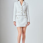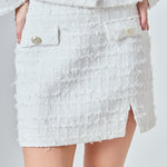 Our trendy Tweed Skirt will add a touch of sophistication to your wardrobe. Perfect for any occasion with its mini length and front side slit it offers both style and versatility. Made from high-quality tweed this skirt is both comfortable and durable. The side zipper with metal hook and eye closure adds a sleek finish making it easy to slip on and off. Elevate your style game with this must-have piece.