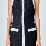 Upgrade your wardrobe with our must-have Tweed Sleeveless Mini Dress. The round neckline and sleeveless design adds a touch of elegance, while contrast details provide a modern twist. Complete with functional front welt pockets and chic buttons, this dress not only adds style but also convenience to your outfit. Made from high-quality tweed fabric, it offers a comfortable and flattering fit. Perfect for any occasion, from day to night, this dress is a timeless addition to your collection. Don't miss out on this versatile piece!