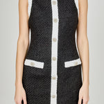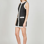 Upgrade your wardrobe with our must-have Tweed Sleeveless Mini Dress. The round neckline and sleeveless design adds a touch of elegance, while contrast details provide a modern twist. Complete with functional front welt pockets and chic buttons, this dress not only adds style but also convenience to your outfit. Made from high-quality tweed fabric, it offers a comfortable and flattering fit. Perfect for any occasion, from day to night, this dress is a timeless addition to your collection. Don't miss out on this versatile piece!